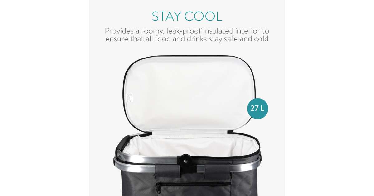 Ez a praktikus, 27 literes Navaris piknik táska tökéletes választás kirándulásokhoz, piknikekhez és bevásárláshoz. Könnyen hordozható, hőszigetelt kialakításának köszönhetően ételeid és italid órákig frissen maradnak. A könnyű alumínium váz és a masszív fogantyú kényelmes viseletet biztosít, míg az összecsukható kialakításnak köszönhetően helytakarékosan tárolható.
