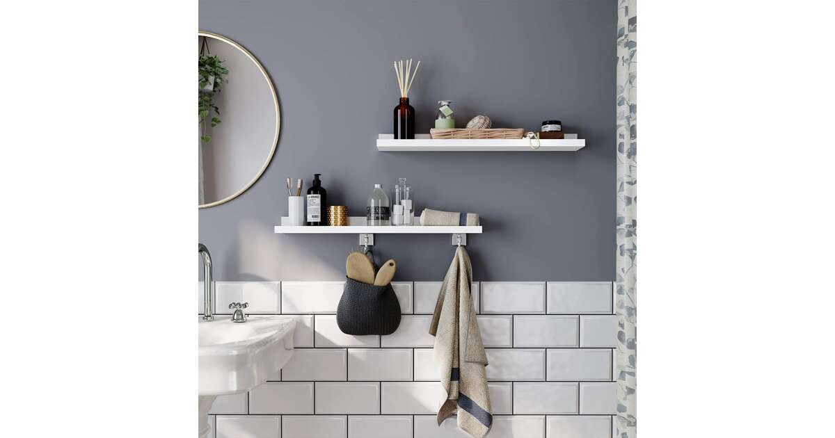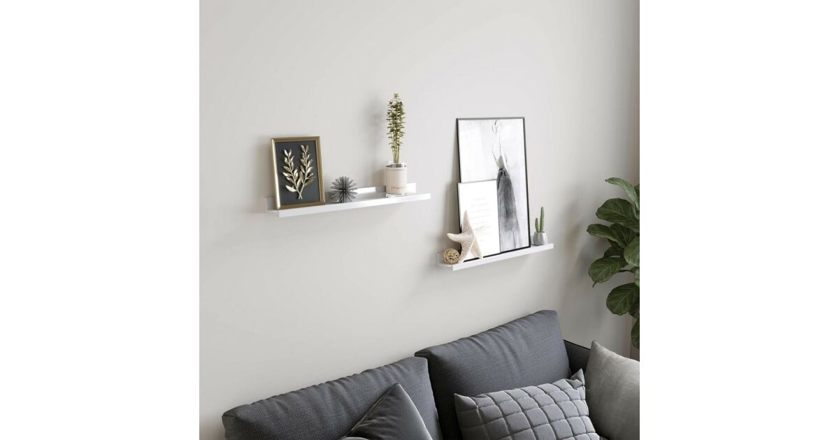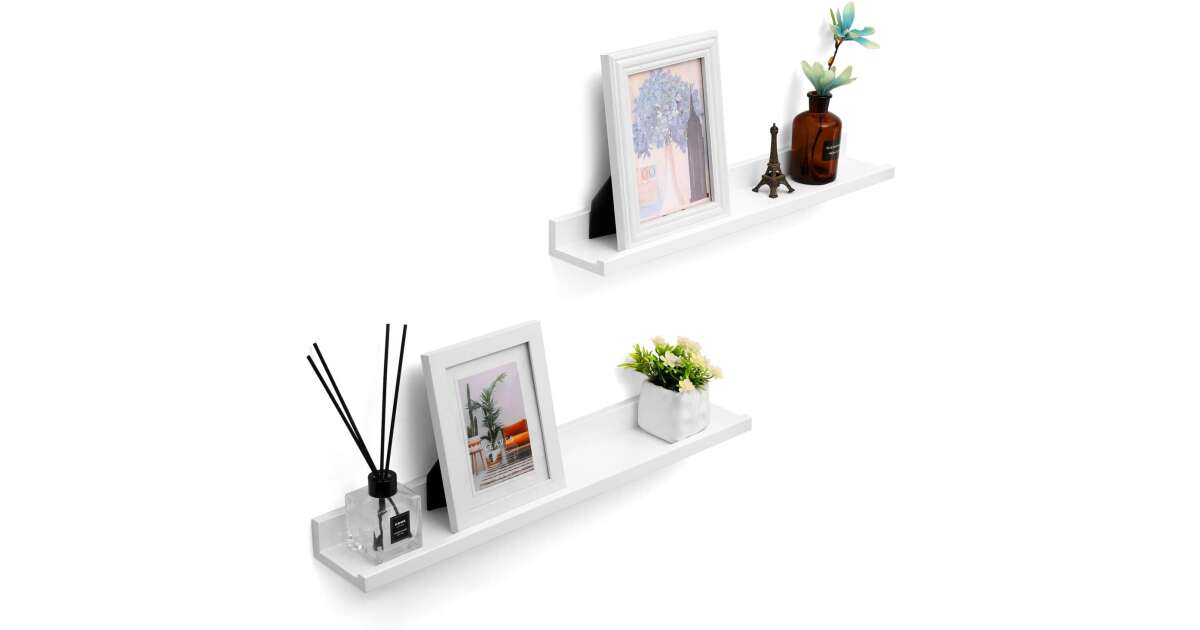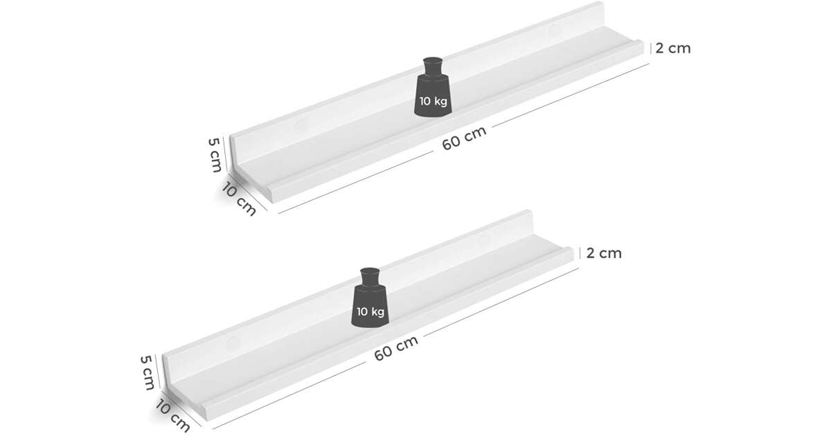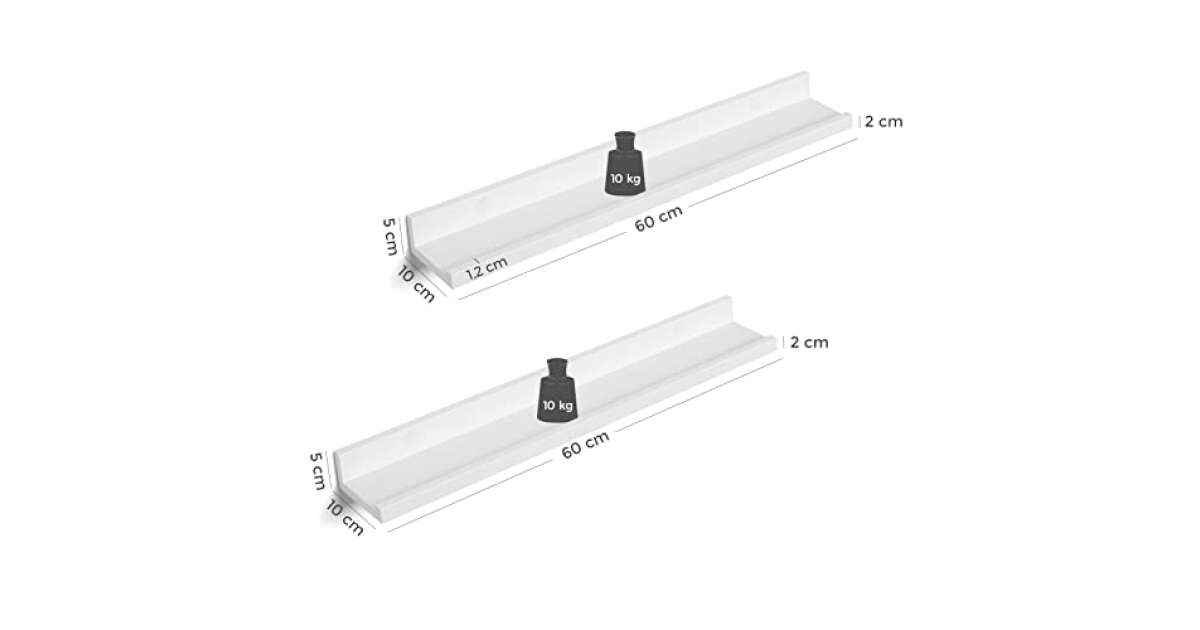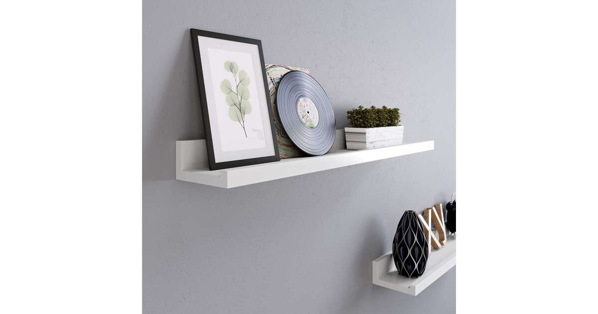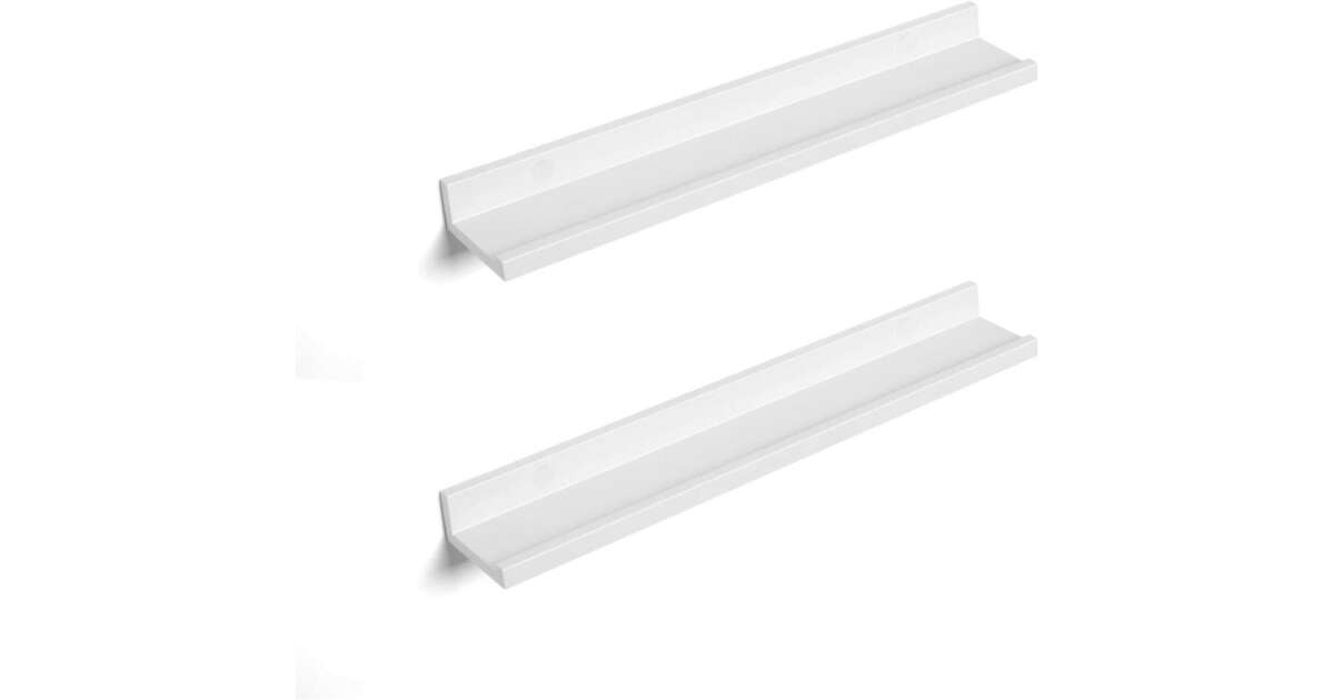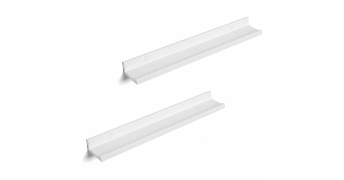 Két darab elegáns, fényes fehér lebegő polc, ideális könyvek, képkeretek, dekorációk elhelyezésére. Könnyen felszerelhető, és modern megjelenést kölcsönöz otthonodnak.