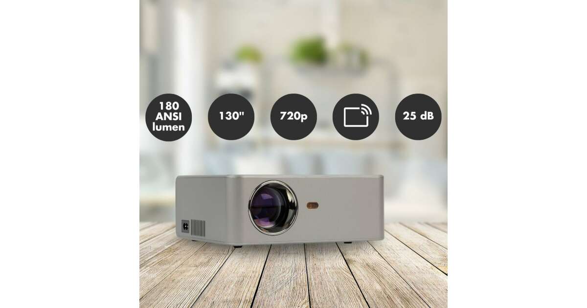 Salora hordozható videoprojektor, integrált Wi-Fi, Házimozi, HD, 2200 lumen, 1280x720 felbontás, 16:9, HDMI port, USB, integrált hangszóró, kompakt, távirányítóval, szürke leírása