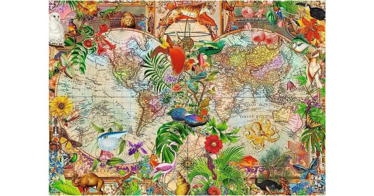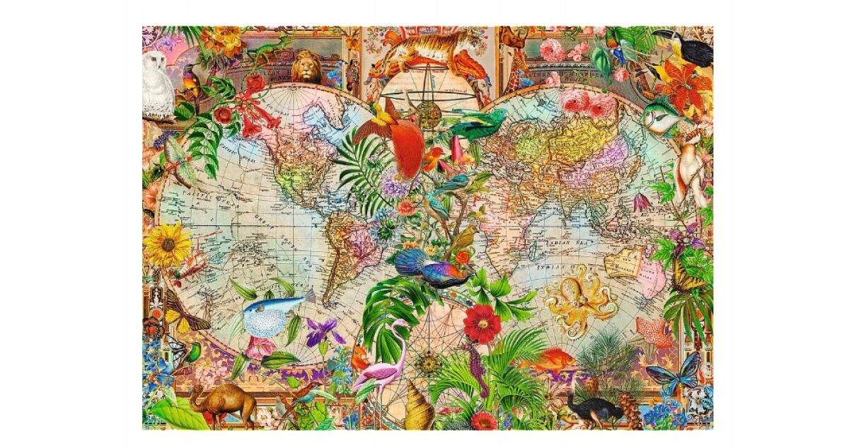 - Gyönyörű design: Az antik világtérkép élénk színekkel és részletgazdag illusztrációkkal van díszítve, trópusi madarakkal, egzotikus virágokkal és más állatokkal.
