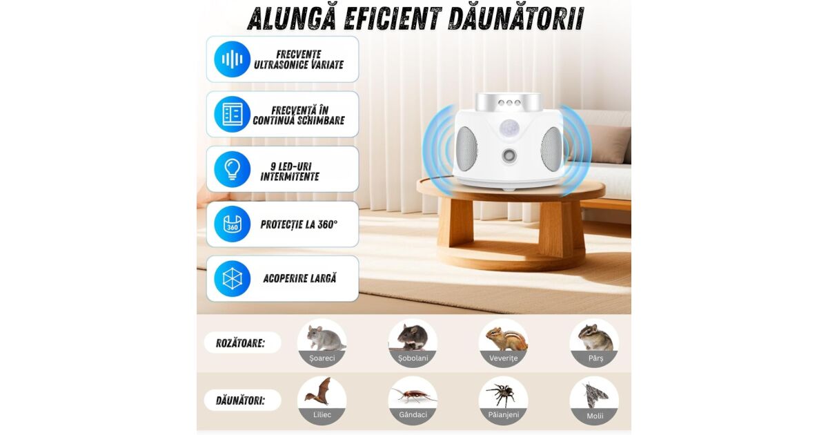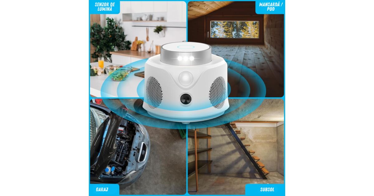 Rágcsálóriasztó, Egér- és Patkányriasztó, Birai® UR02S, 360°-os hatás, 120 m2-es lefedettség, 3 üzemmód, 4 nagy teljesítményű hangszóró, 9 villogó LED, USB-C, mozgásérzékelő, kettős ultrahang leírása