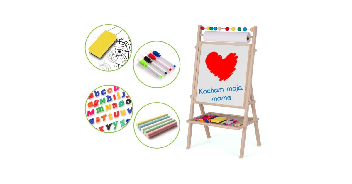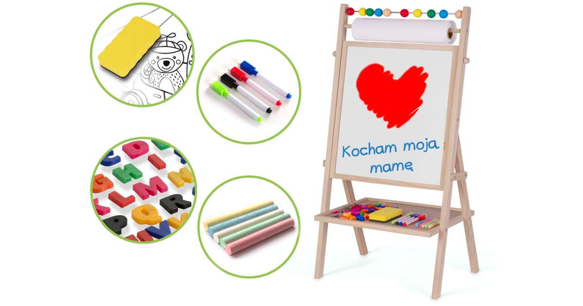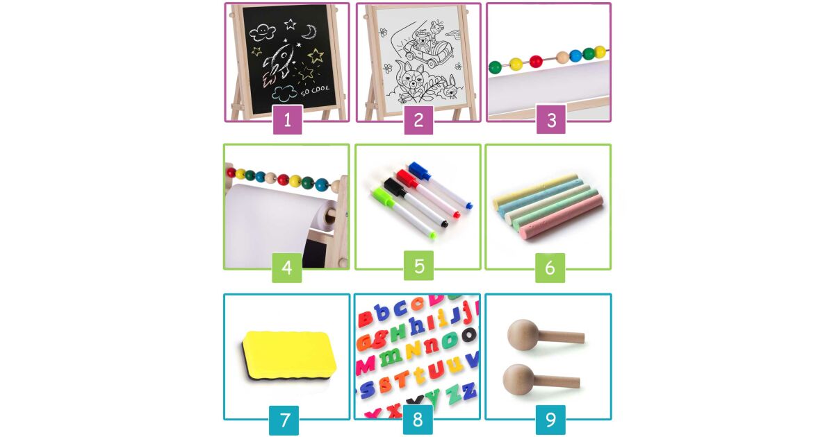 - 🎨 Teljes kiegészítő készlet: Kréták, filctollak, szivacs, mágneses betűk és számok.