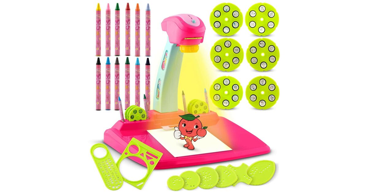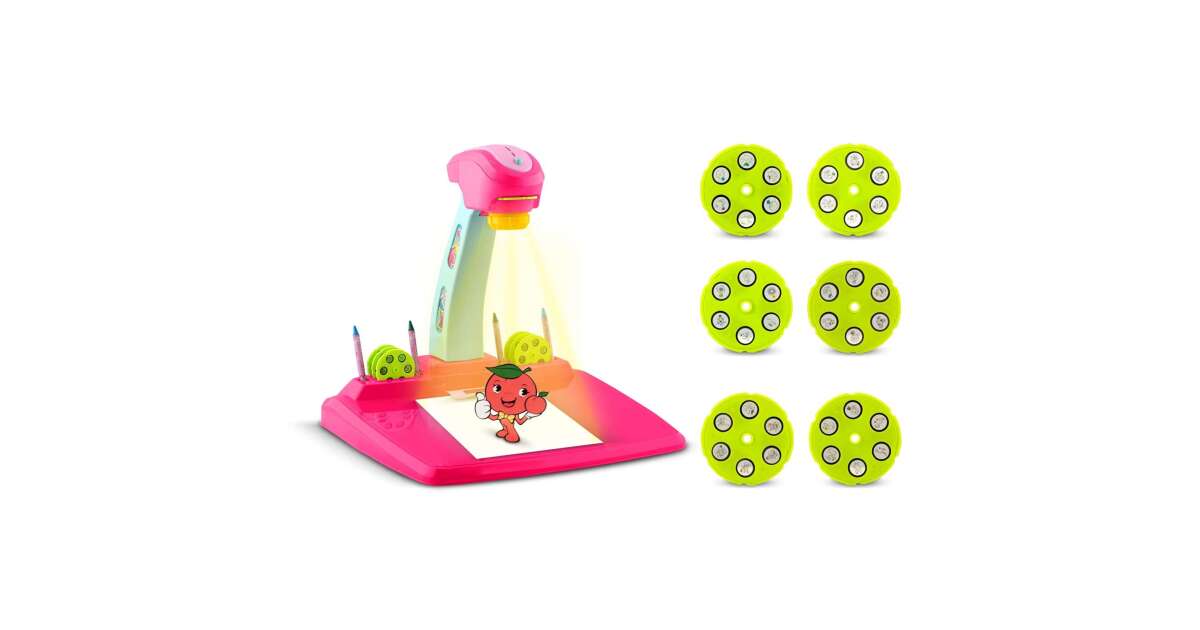 Ez a vidám rózsaszín Ricokids rajzvetítő tökéletes választás a kis művészeknek! 36 izgalmas képet vetíthet ki 8 különböző sablon segítségével, így a gyerekek könnyedén elkészíthetik kedvenc rajzaikat. A készlet 12 színes ceruzát is tartalmaz.