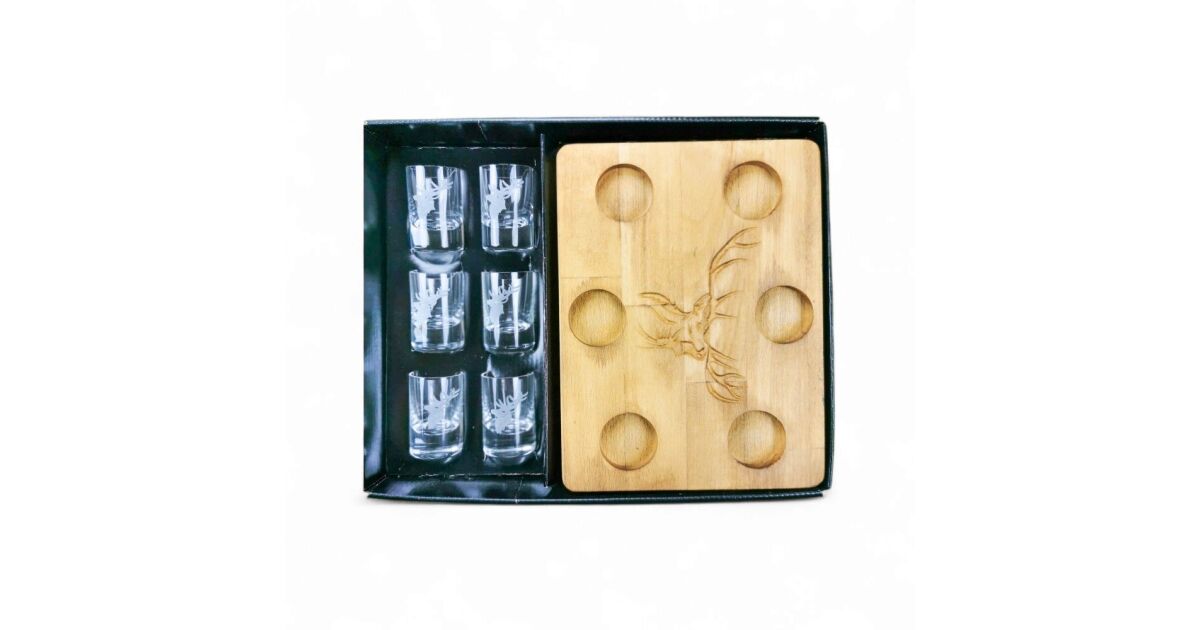 - Elegáns megjelenés: A szarvasfejes fatál és a gravírozott poharak egyedi és stílusos megjelenést kölcsönöznek a készletnek.
