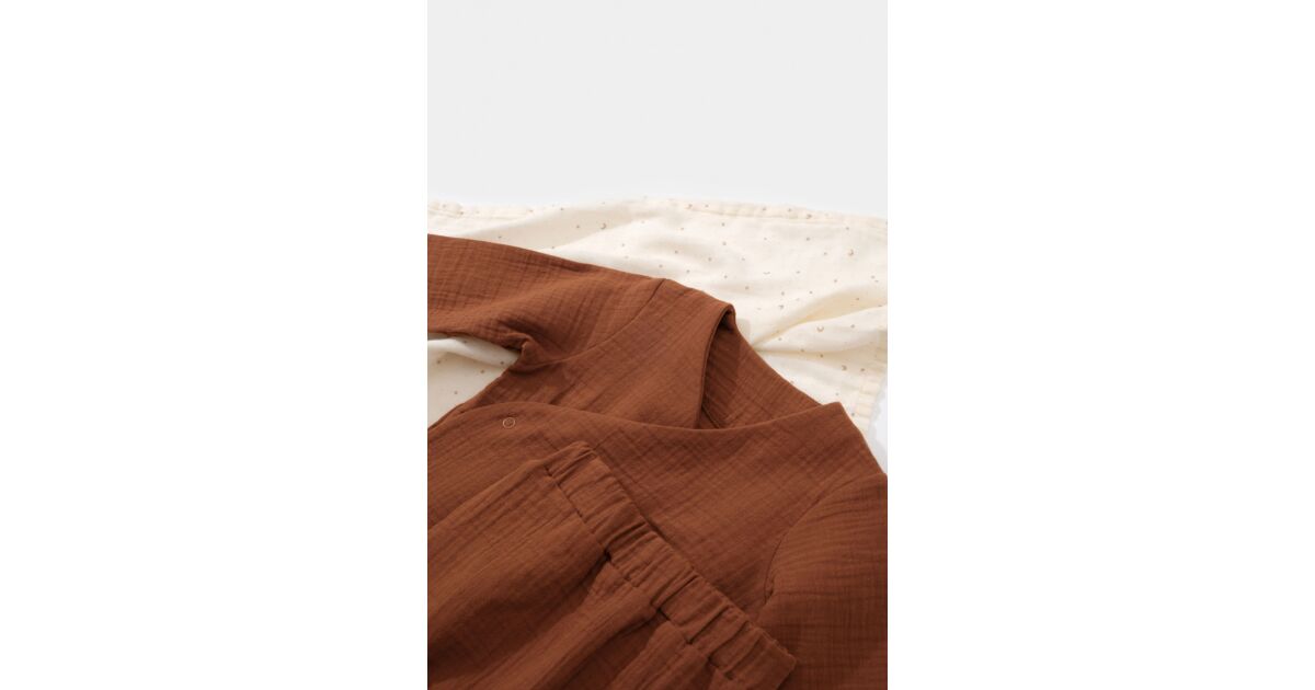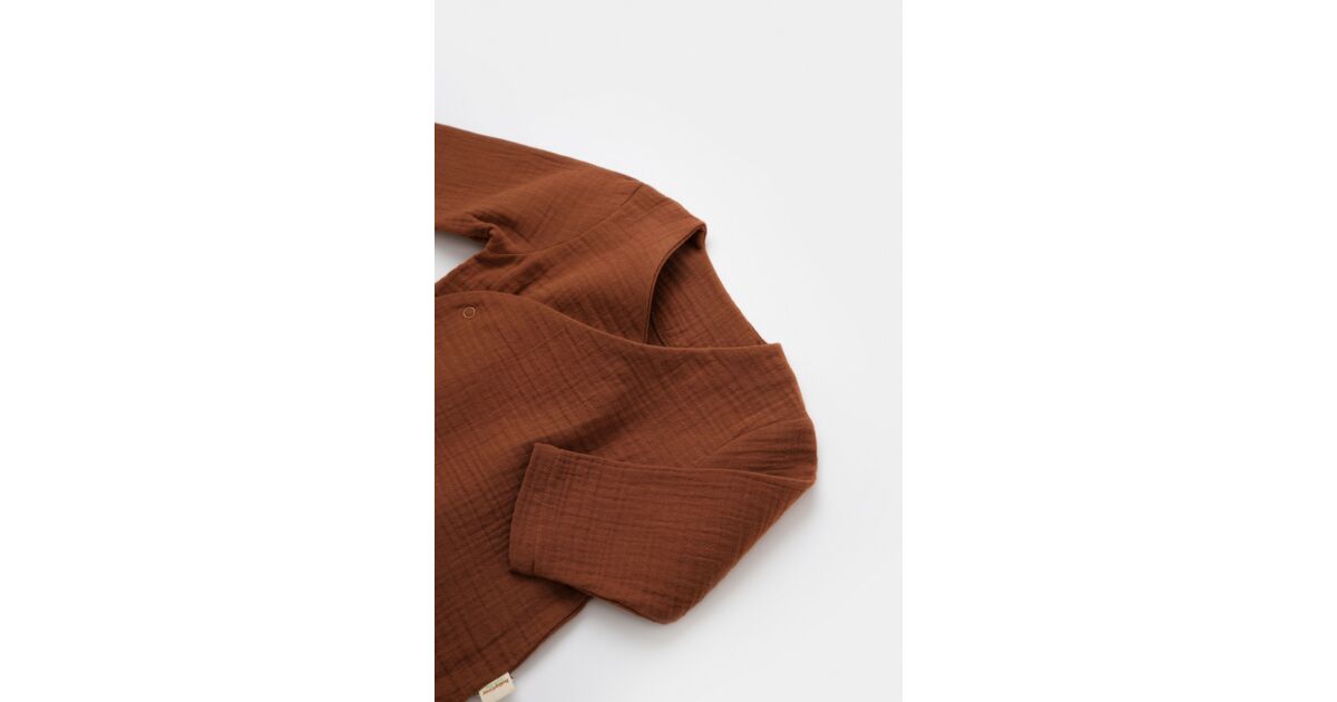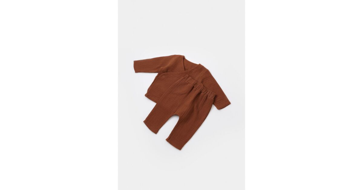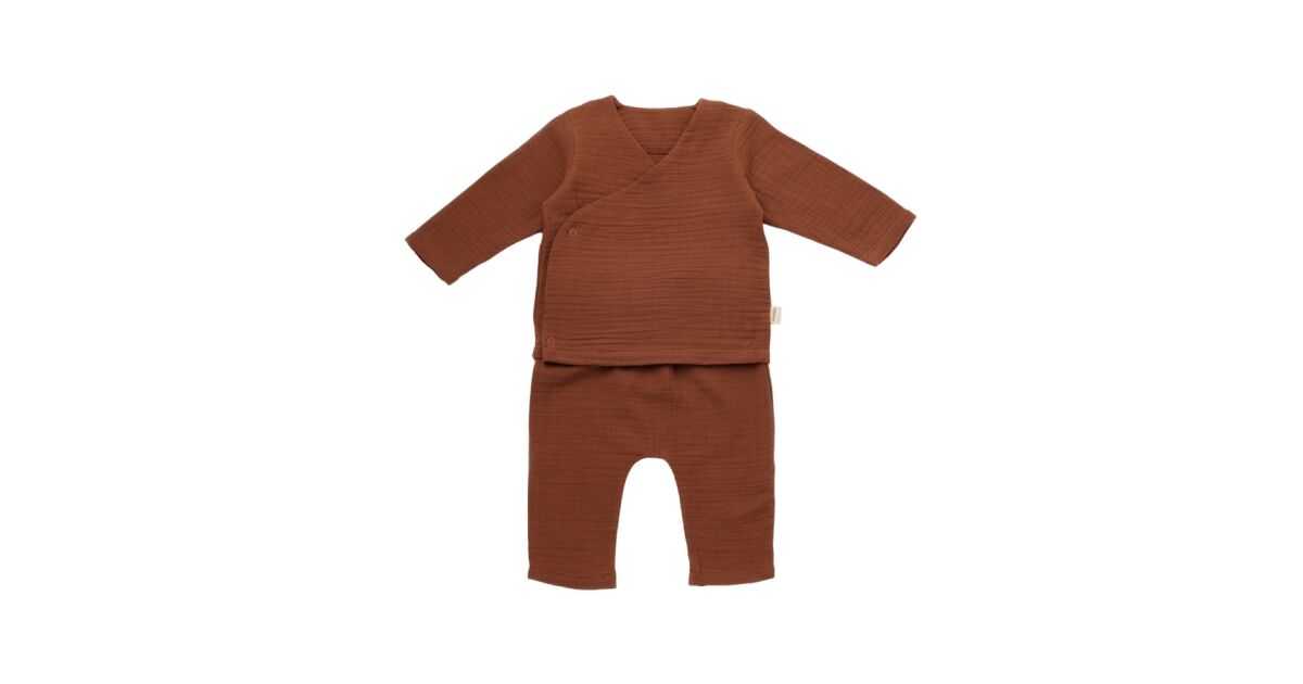 Ezt a terméket így is ismerheted: Elhasznált blúz és hosszú muszlin nadrág garnitúra, BabyCosy, 100% organikus pamut, tégla (Méret: 18-24 hónap)