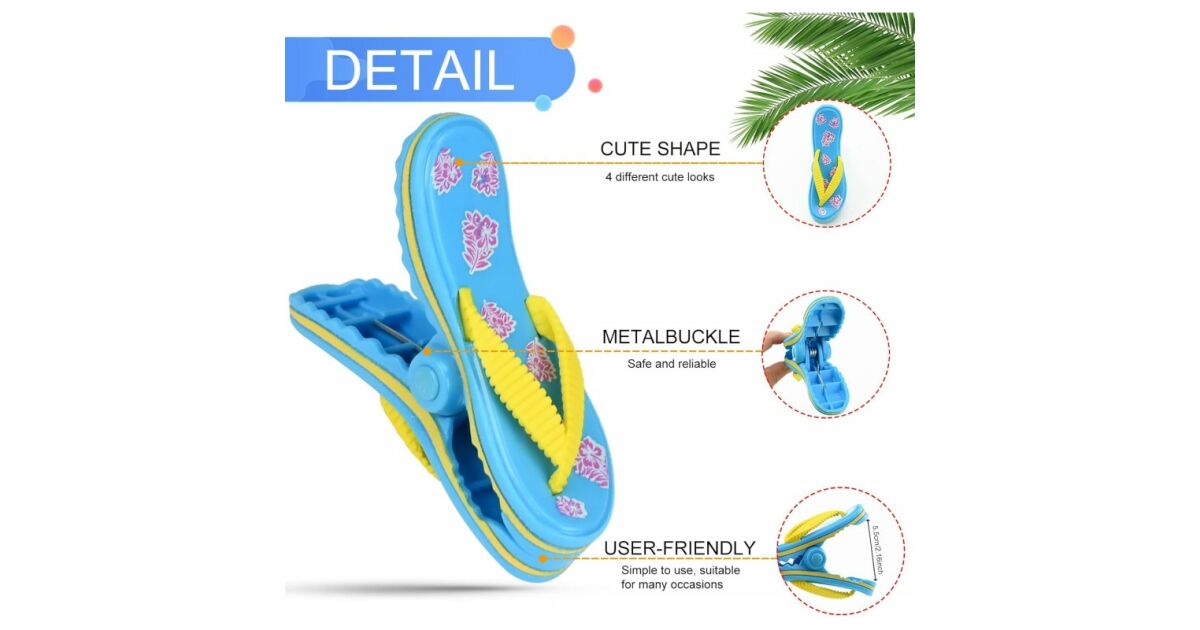 Ezek a cuki, papucs formájú törölközőcsipeszek ideálisak a törölközők rögzítésére a strandon, a medencénél vagy bárhol máshol, ahol meg kell akadályozni, hogy a szél elfújja a törölközőt. Velük gondtalanul élvezheted a pihenést, anélkül, hogy azon kellene aggódnod, hogy a törölköződ elrepül.