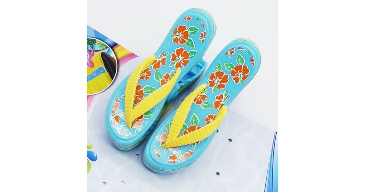 - Aranyos design: A csipeszek vidám, papucs formájú designnal rendelkeznek, virágmintával, ami feldobja a strandot.