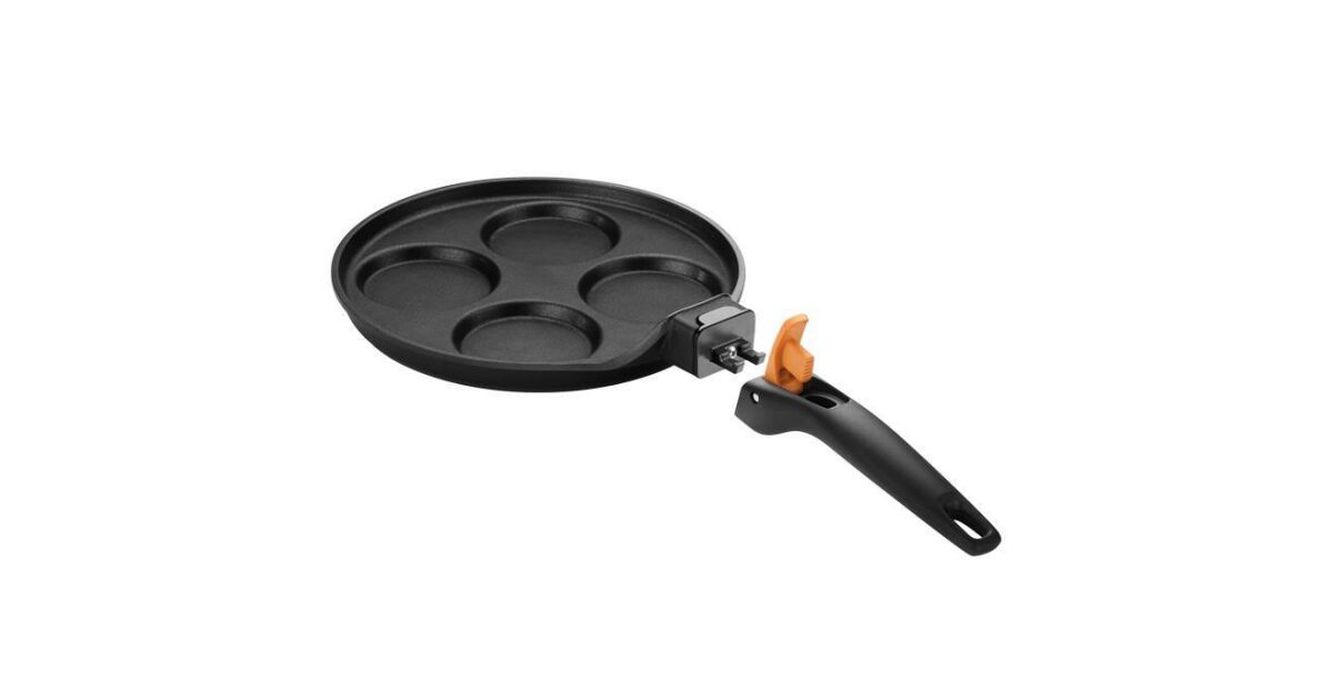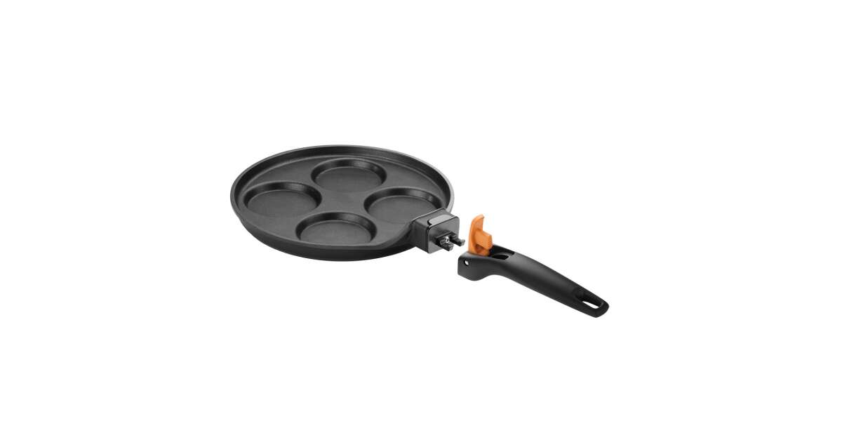 Ez a masszív, 4 fészkes tükörtojássütő serpenyő forradalmasítja a reggeli elkészítését! A levehető nyélnek köszönhetően könnyen tárolható, és minden típusú tűzhelyen használható, beleértve az indukciósat is. Prémium minőségű tapadásmentes bevonata garantálja az egyszerű tisztítást és az ételek könnyű eltávolítását.