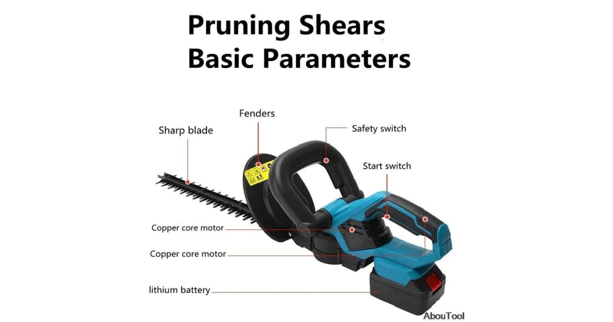 Foarfeca pentru gradina, electrica, pentru gardul viu, cu acumulator inclus, folosire fara fir, autonomie 3-4 ore, zgomot redus si utilizare usoara, negru/albastru