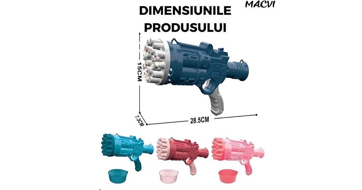 Macvi® 24 lyukú buborékfúvó pisztoly, erős ABS szerkezet, forgó cső, turbó effekt, interaktív játék gyerekeknek és szabadtéri szórakozásra, Sötétkék leírása