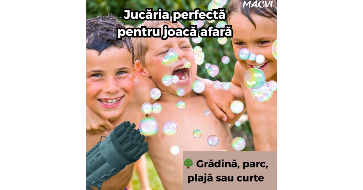 Macvi® 24 lyukú buborékfúvó pisztoly, erős ABS szerkezet, forgó cső, turbó hatás, interaktív játék gyerekeknek és szabadtéri szórakozásra, Visiniu vélemények