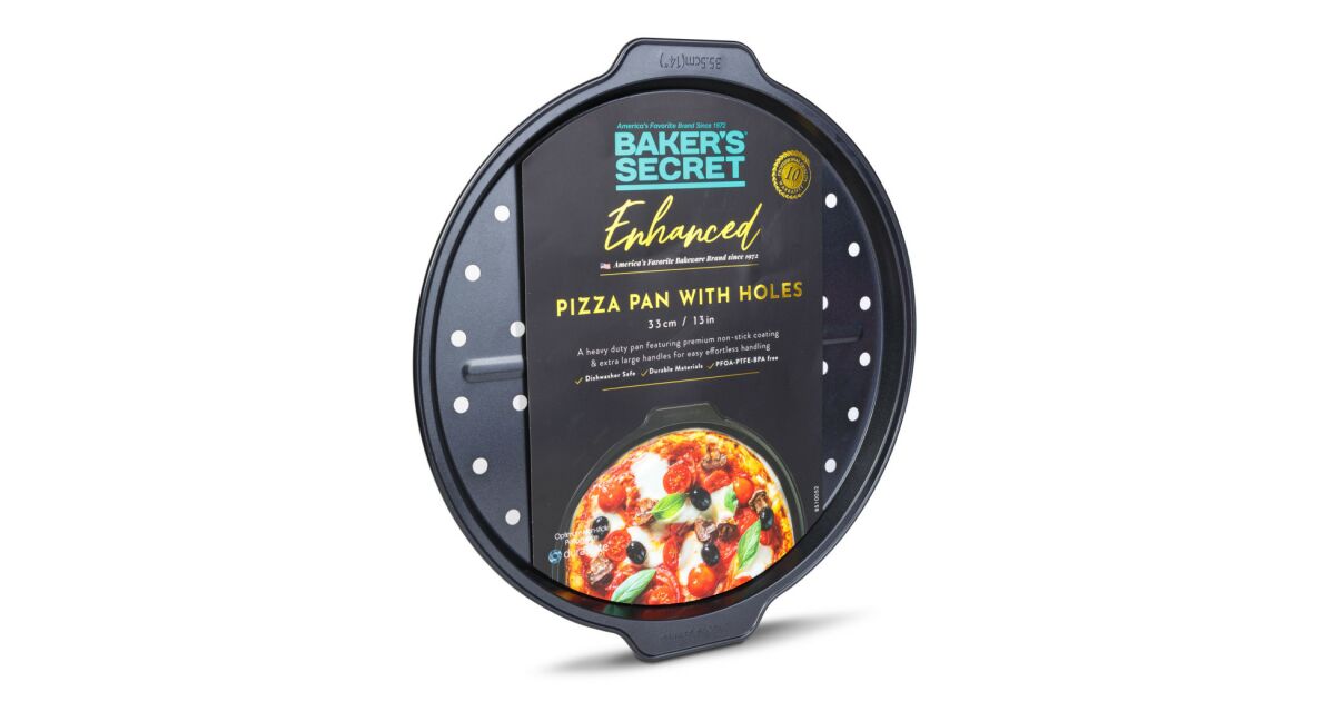 Készítsen könnyedén finom, ropogós pizzát otthonában ezzel a kiváló minőségű Baker's Secret pizza sütőformával! A lyukacsos kialakításnak köszönhetően a pizza alja egyenletesen sül át, és kellemesen ropogós lesz. A vastag fém anyag gyors és egyenletes hőeloszlást biztosít.