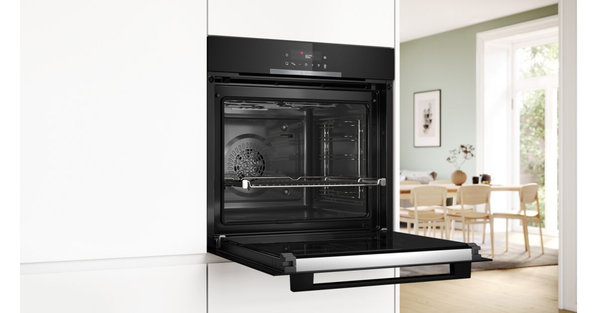 BOSCH HBA372EB4 Önállóan beépíthető sütő, Serie4, fekete, 71 l, 7 funkció, 3D hőlégbefúvás, A+, pirolitikus öntisztítás, AutoPilot10, AirFry sütési mód (AirFry tepsi tartozék), teleszkópos sütősín