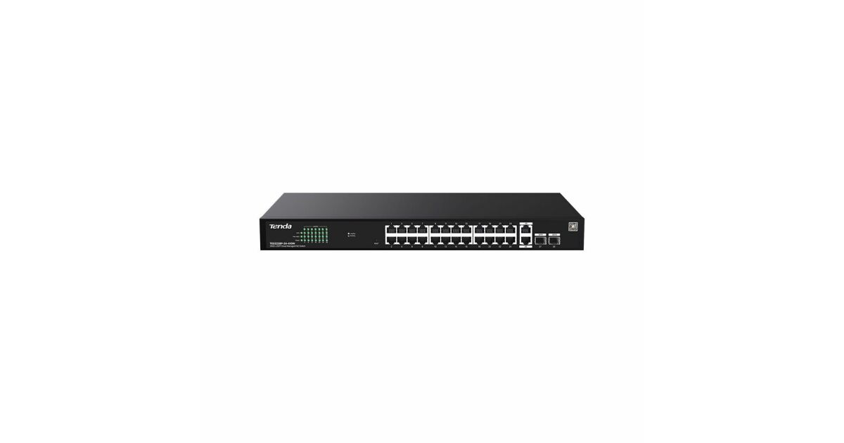 A Tenda TEG2228P-24-410W egy menedzselhető PoE switch, amely ideális választás kis- és középvállalatok számára, akik megbízható és nagy teljesítményű hálózati megoldást keresnek. A switch 24 darab 1 Gbps-es porttal, 2 darab 1 Gbps-es uplink porttal és 2 darab SFP porttal rendelkezik, így rugalmasan bővítheti hálózatát.