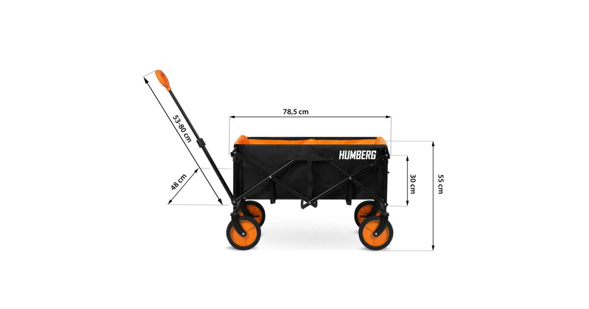 A Humberg HM-513 összecsukható szállító kocsi kiváló minőségű anyagokból készült, és rendkívül strapabíró. Könnyen kezelhető, még nagyobb terhek szállítása esetén is. A praktikus zsebeknek köszönhetően italokat és egyéb apróságokat is könnyedén szállíthatsz benne. Összecsukható kialakítása miatt helytakarékosan tárolható, és könnyen szállítható.