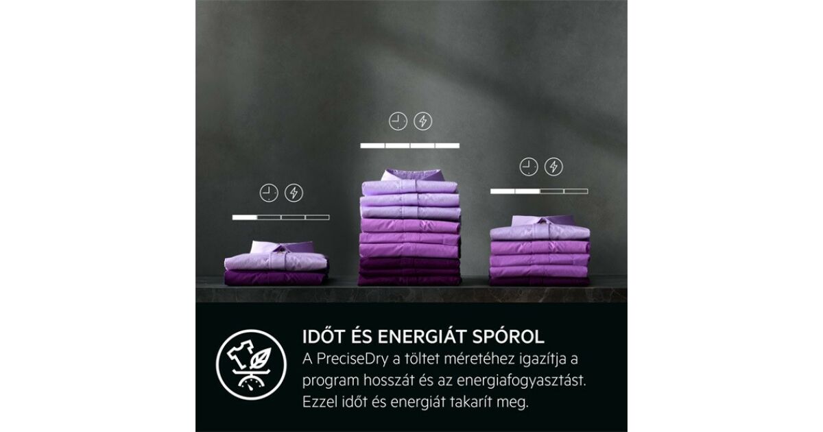 - PreciseDry: A töltet méretéhez igazítja a program hosszát és az energiafogyasztást, ezzel időt és energiát spórolva.