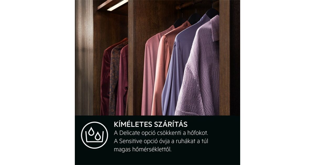 - Kíméletes szárítás: A Delicate opcióval óvja a ruhákat a túl magas hőmérséklettől.