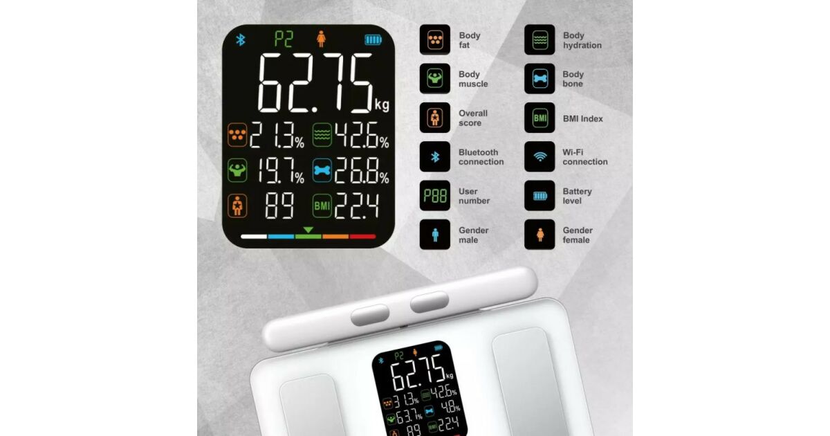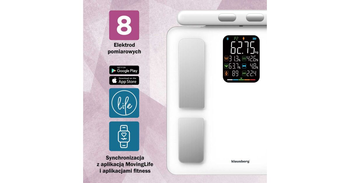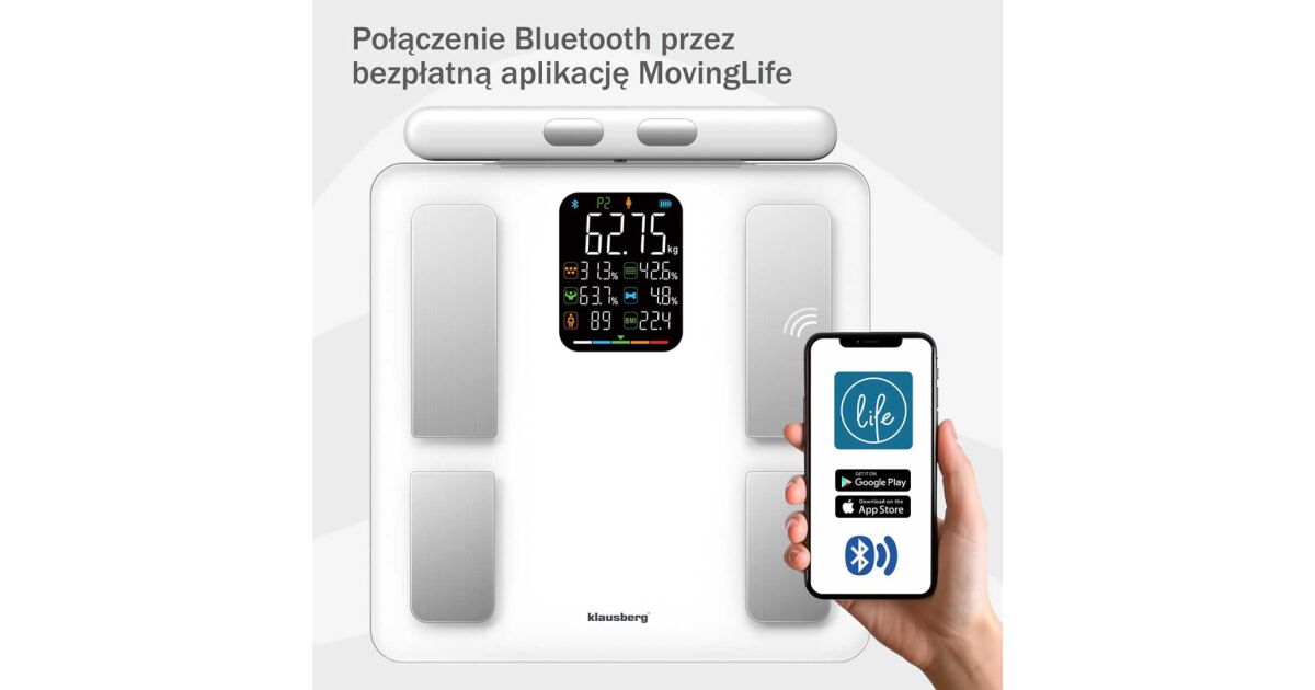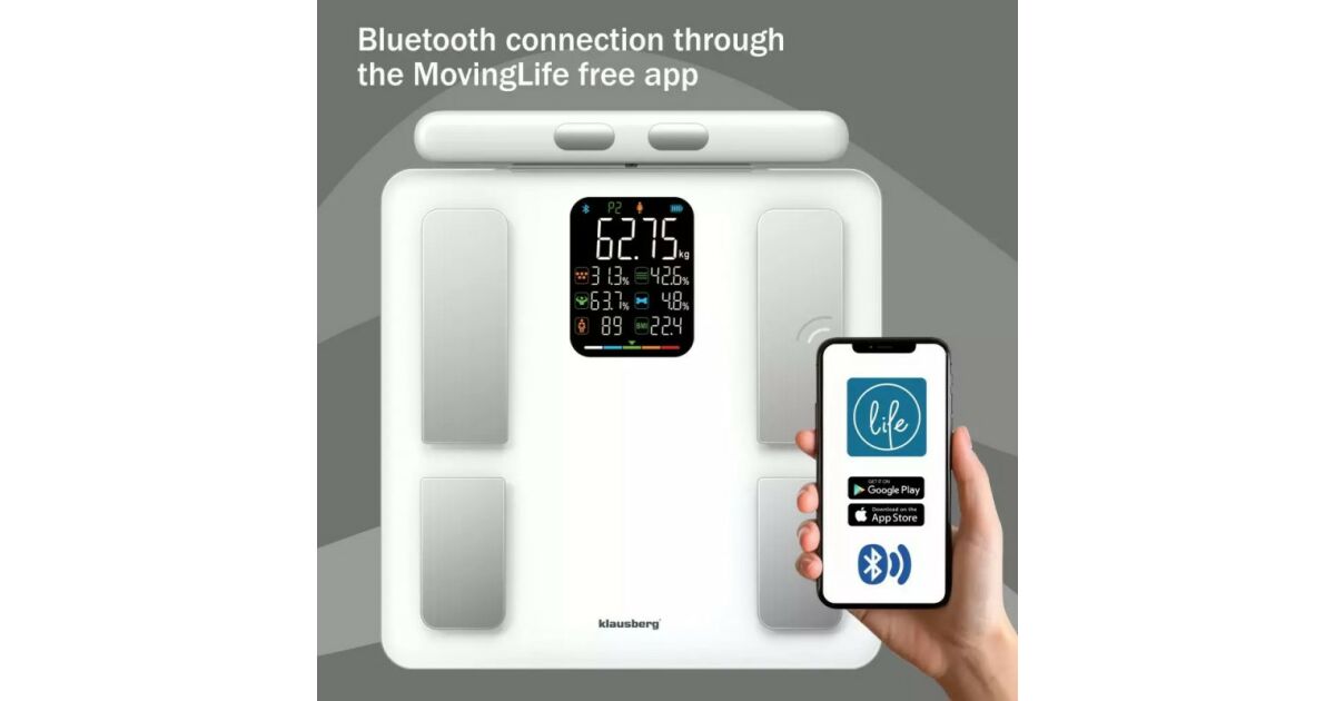 A Klausberg KB-7857 okosmérleg nem csupán egy mérleg, hanem egy komplex testösszetétel-elemző eszköz, mely segít nyomon követni egészségedet a MovingLife alkalmazáson keresztül. Bluetooth kapcsolatának köszönhetően adataidat könnyedén szinkronizálhatod Android vagy iOS készülékeddel.