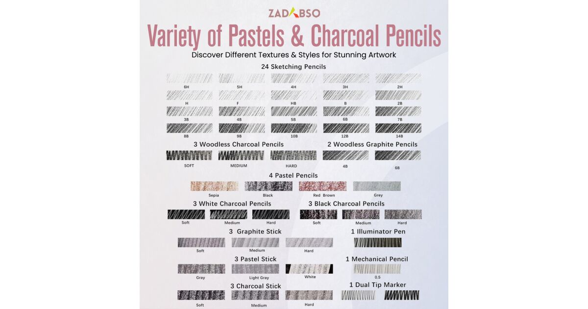 - Grafitceruzák: 24 különböző keménységű (14B-től 6H-ig) a finom vonalaktól a mély árnyékolásig.
