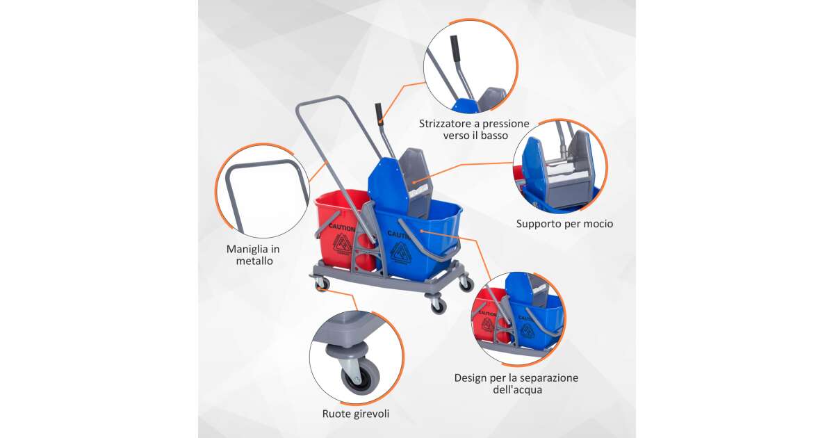 A HOMCOM Wringer babakocsink tökéletes a professzionális padlótisztításhoz. Kiváló minőségű műanyagból készült, tartós és ellenálló. 2 nagy, 25 literes vödörrel rendelkezik. A 4 praktikus keréknek és a kényelmes fogantyúnak köszönhetően könnyen szállítható és kéznél is praktikus.