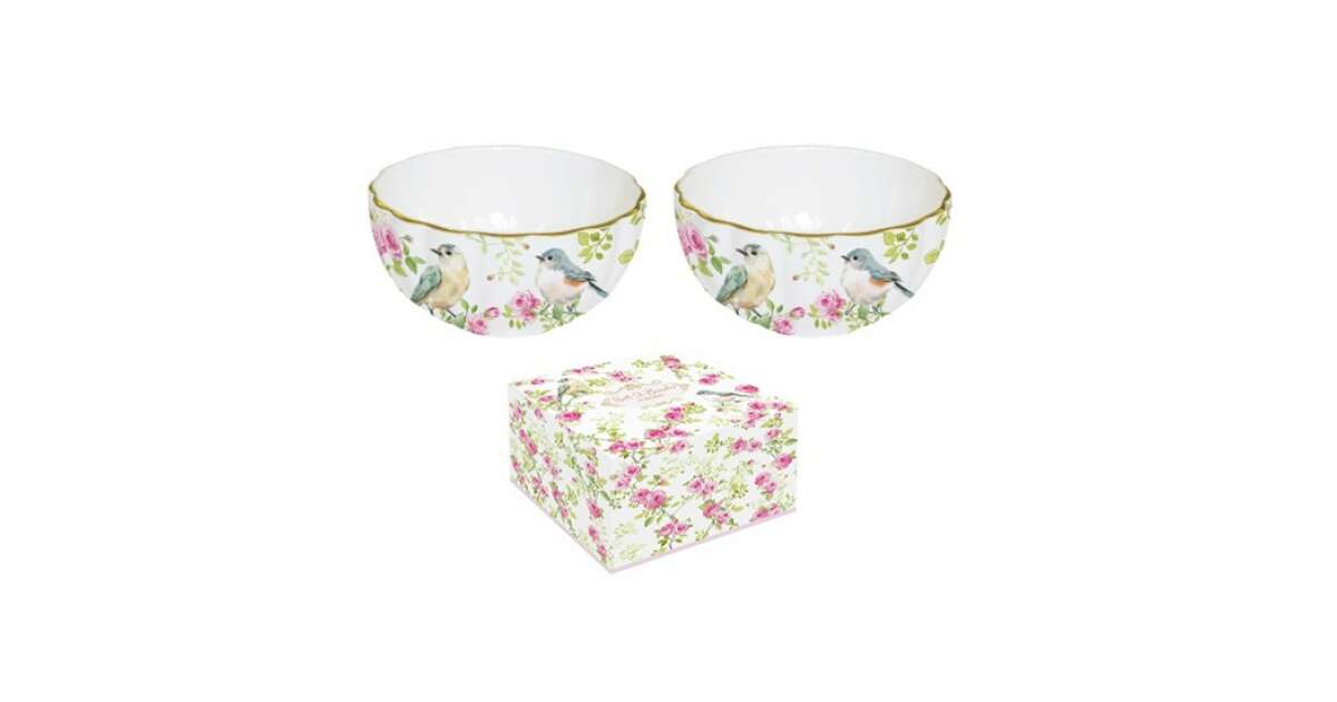 Ez a 2 darabos porcelán tálkakészlet tökéletes választás a tavaszi hangulat megteremtéséhez. A gyönyörű madaras és rózsás minták vidám és elegáns megjelenést kölcsönöznek az asztalnak. A tálkák ideálisak desszertek, saláták vagy aprósütemények tálalásához.