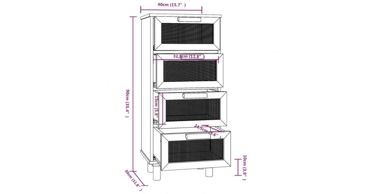 - 4 fiók rattan betétekkel: Bőséges tárolóhelyet kínál a holmijaid rendezett elhelyezéséhez. A rattan betétek pedig extra stílusos megjelenést kölcsönöznek. 🌿