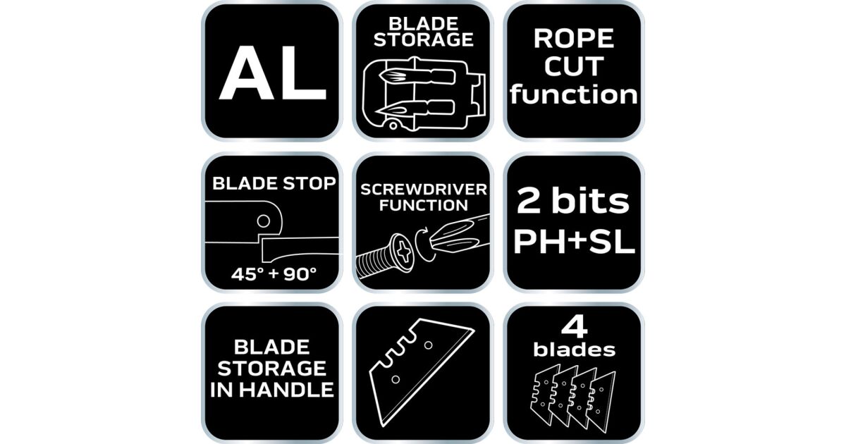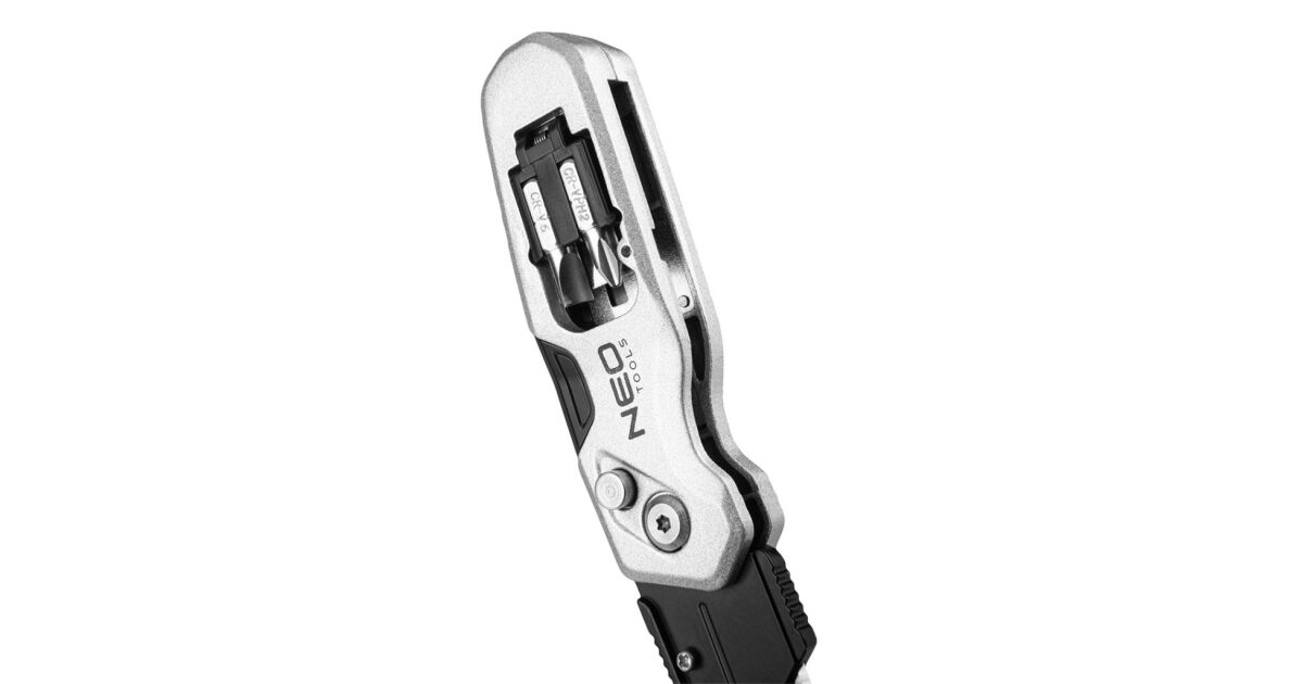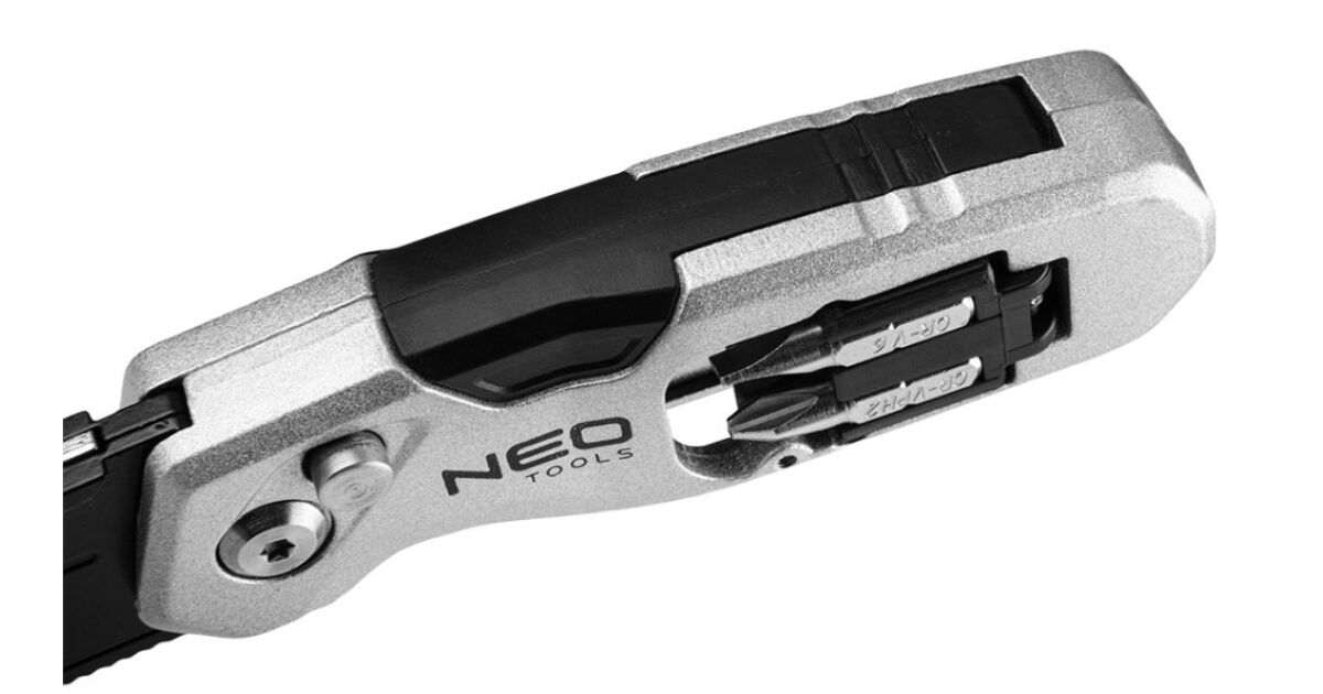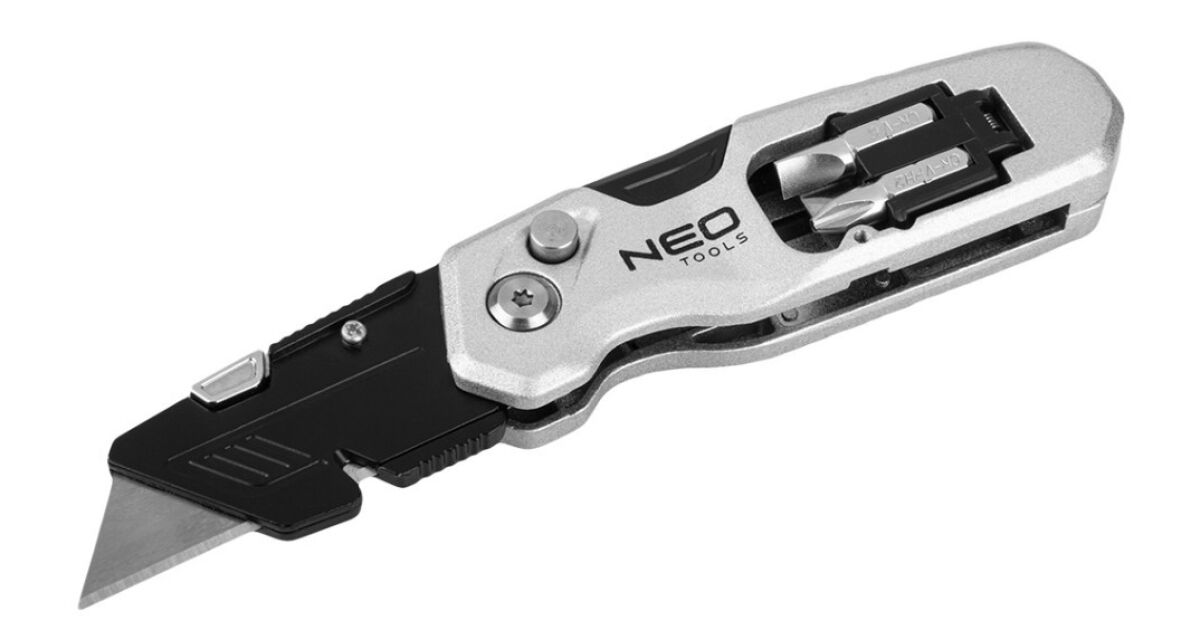 NEO TOOLS Trapézpengés kés, összecsukható, alu házas, 1+3 penge, 2 db csavarhúzóbittel 63-705