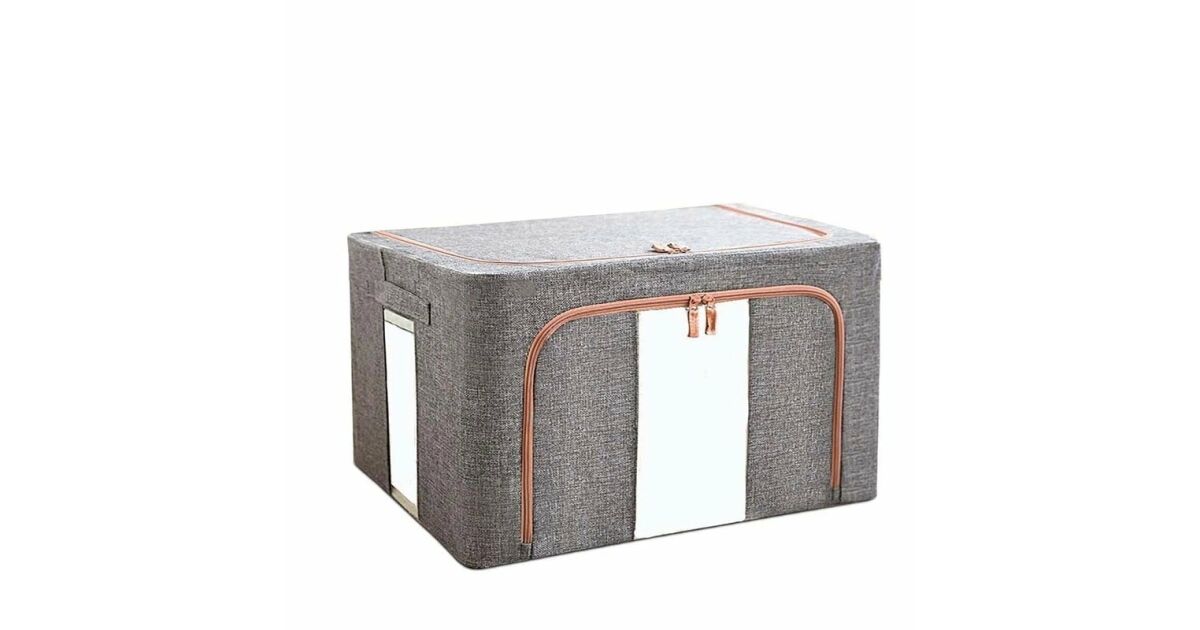 Ezt a terméket így is ismerheted: Összecsukható tárolódoboz, Flippy, 24 l, pamut és lenvászon, 40x30x20 cm, 2 ablak, elöl és oldalt, 2 ajtó kétirányú cipzárral, fém keret, stabil műanyag alaptartó, szürke