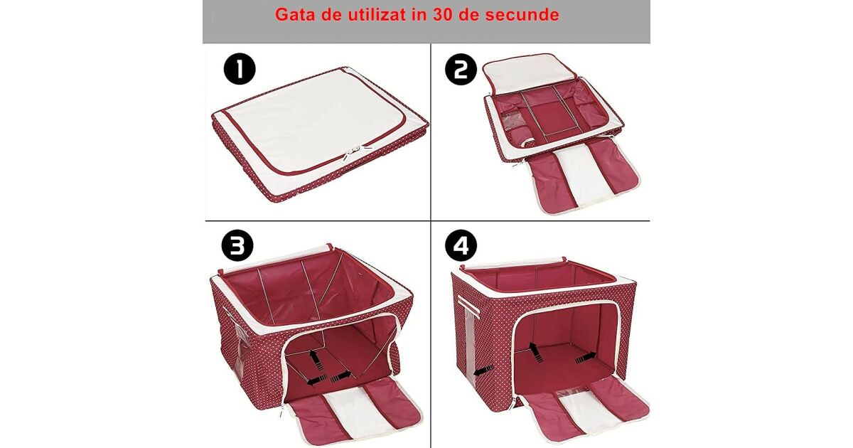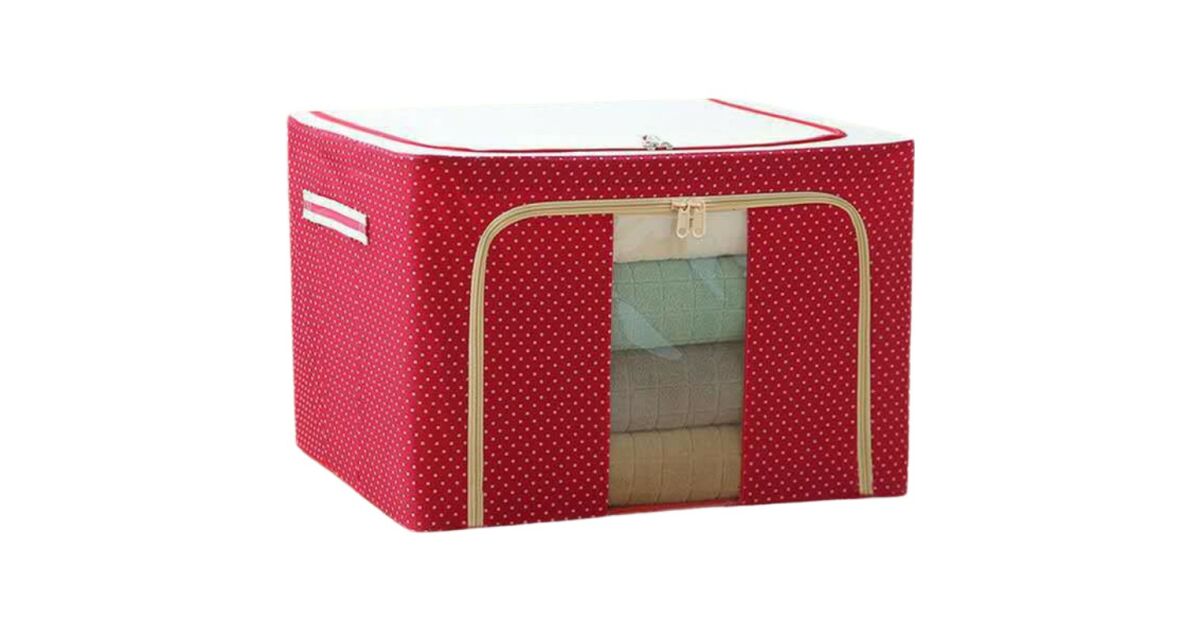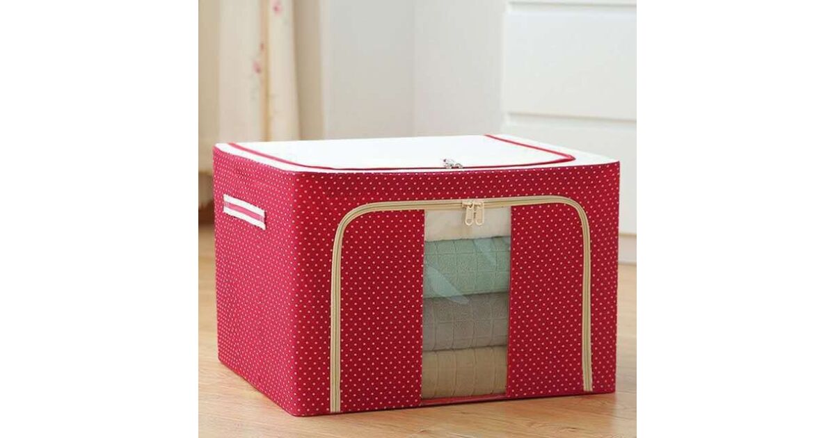 Összecsukható tárolódoboz, Flippy, cipzárral, 100 L, Textil, 60x42x40 cm, Egy ablak, Fém keret, Stabil műanyag alaptartó, Pöttyös nyomat, Piros vélemények