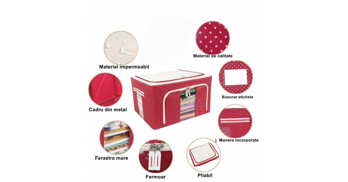 Összecsukható tárolódoboz, Flippy, cipzárral, 100 L, Textil, 60x42x40 cm, Egy ablak, Fém keret, Stabil műanyag alaptartó, Pöttyös nyomat, Piros vásárlás: