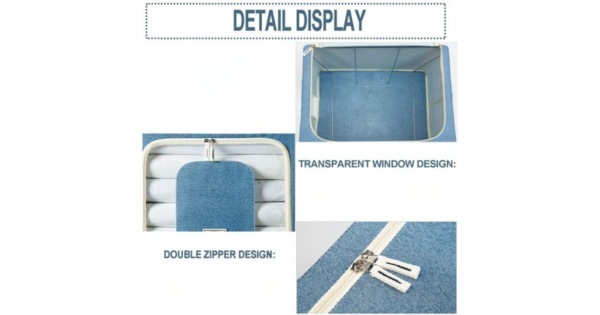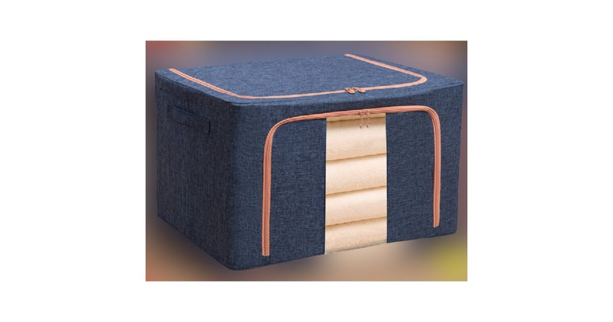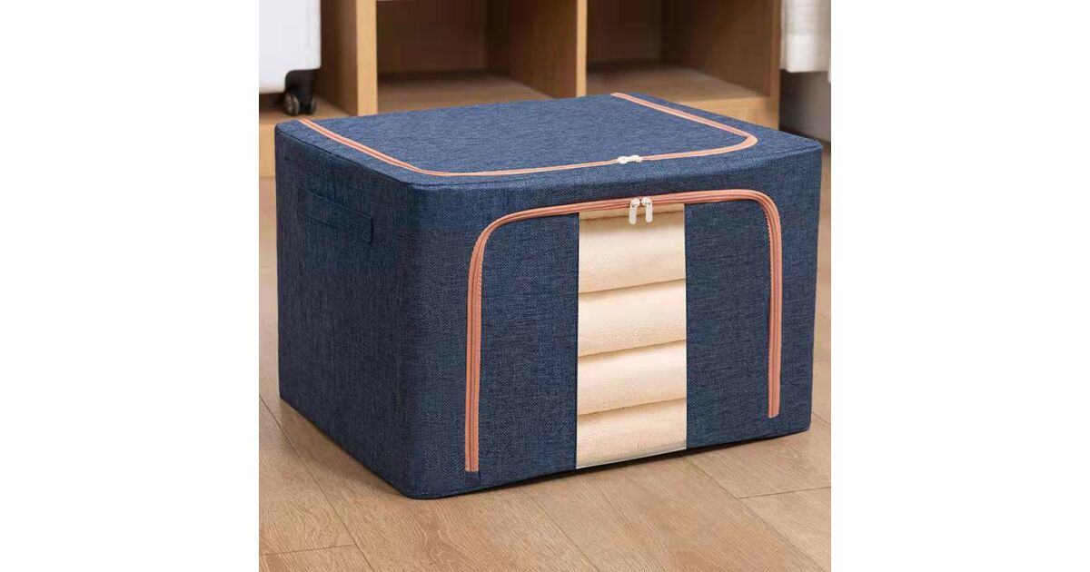 Ezt a terméket így is ismerheted: Összehajtható tárolódoboz, Flippy, 66 L, pamut és lenvászon, 50x40x33 cm, első ablak, 2 bejárati ajtó kétirányú cipzárral, fém keret, stabil műanyag alaptartó, sötétkék