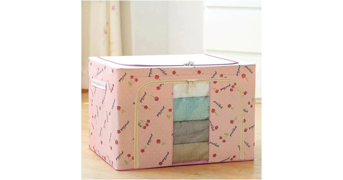 Összehajtható tárolódoboz, Flippy, Cipzárral, 100 L, Textil, 60x42x40 cm, Ablakkal, Fém kerettel, Stabil műanyag alaptartóval, Cseresznyenyomattal, Rózsaszín vélemények