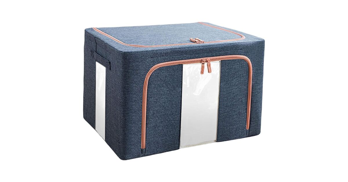 Összehajtható tárolódoboz, Flippy, Cipzárral, 100 L, Textil, 60x42x40 cm, Fém keret, Stabil műanyag alaptartó, Sötétkék, Két ablakkal