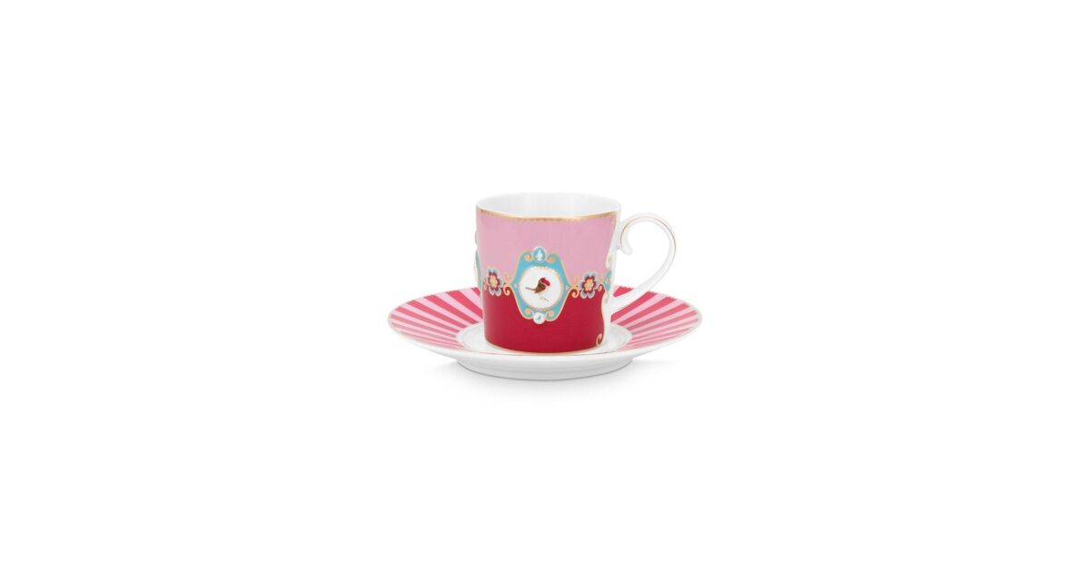 Espresso bögre csészealjjal, Pip Studio, 200 ml, piros és rózsaszín, Love Birds kollekció