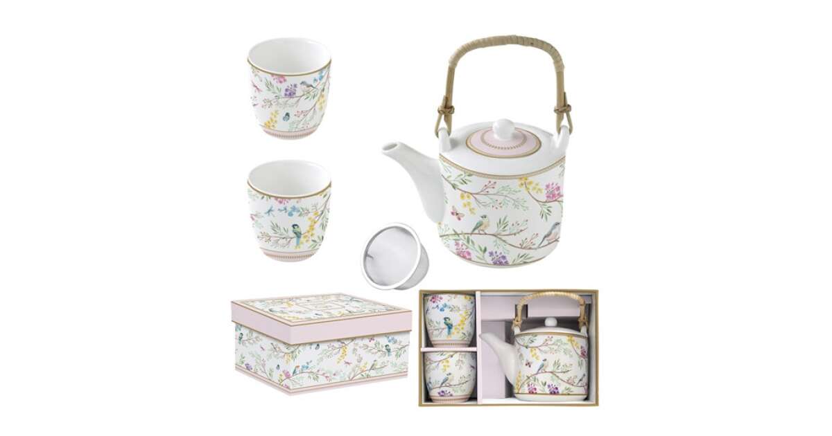 R2S.1467BIME Porcelán teáskanna 600ml, fémszürővel, 2 porcelánpohárral 160ml, dobozban, Birds Melody leírása