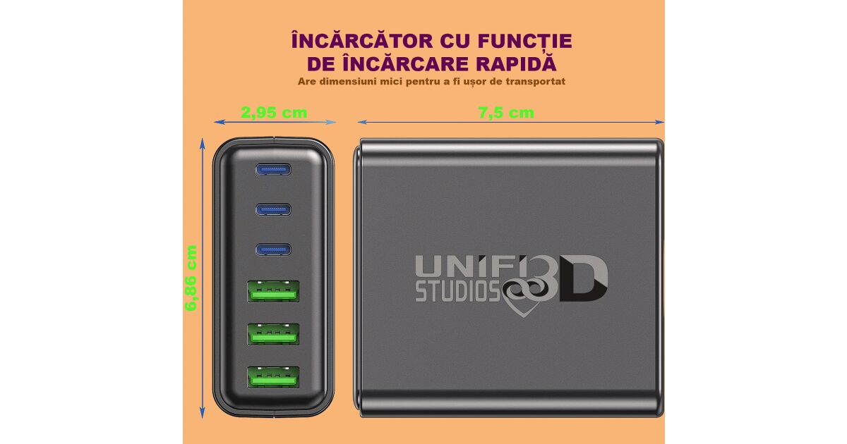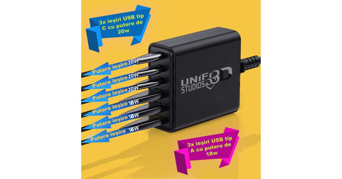 Încărcător USB-C 96W Fast Charge – Stație Încărcare 6 Porturi | Compatibil iPhone, iPad, Samsung, Android, AirPods, Switch | Design Compact, Negru