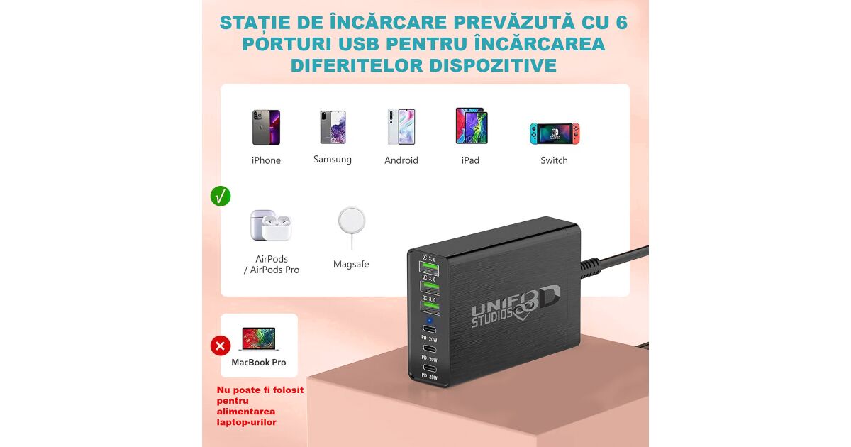 Ezt a terméket így is ismerheted: Încărcător USB-C 96W Fast Charge – Stație Încărcare 6 Porturi | Compatibil iPhone, iPad, Samsung, Android, AirPods, Switch | Design Compact, Negru