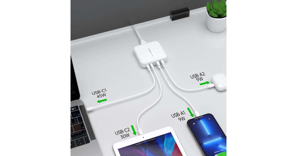 - 2x USB-C + 2x USB-A port: Több eszköz egyidejű töltése.