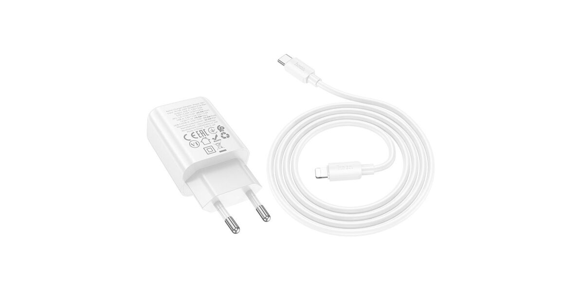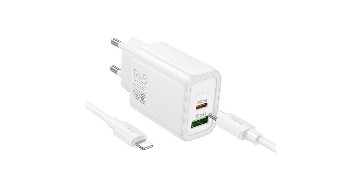 Hoco N61 hálózati töltő 1xUSB-A és 1xUSB-C csatlakozással + Type-C - Lightning kábellel 20W 3A PD QC3.0 - fehér