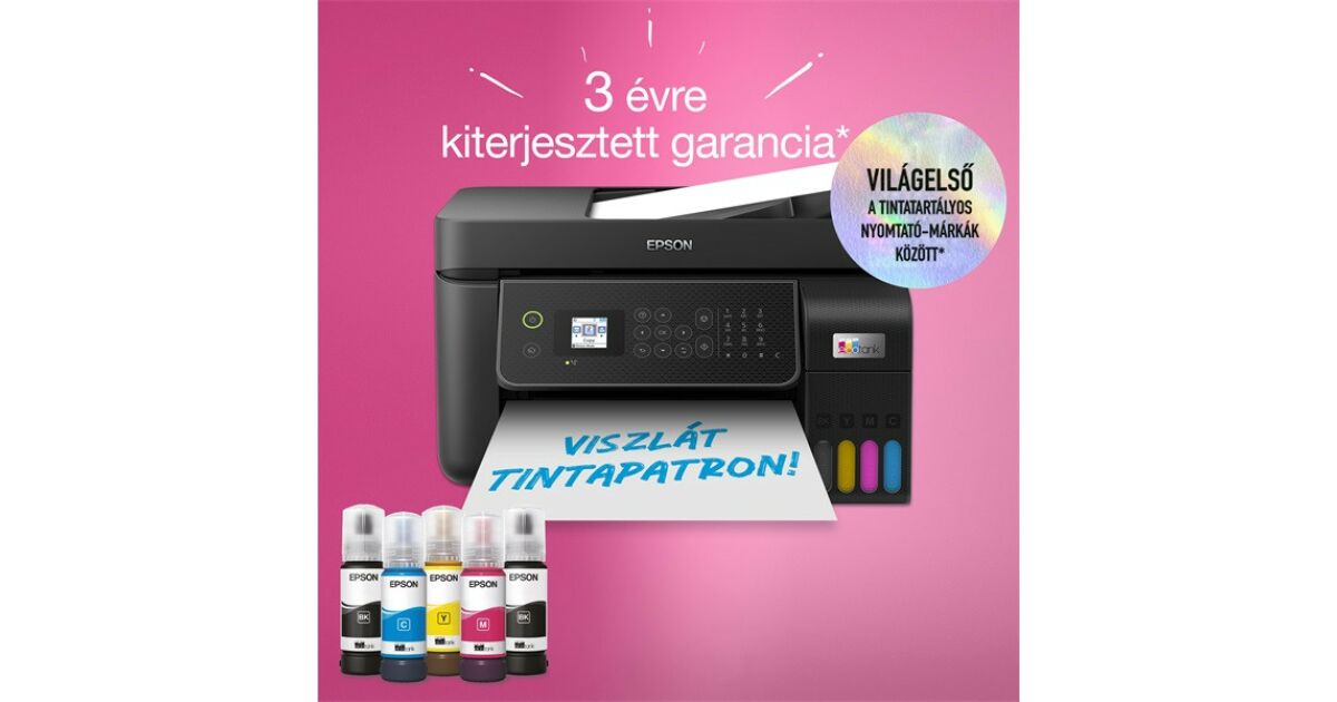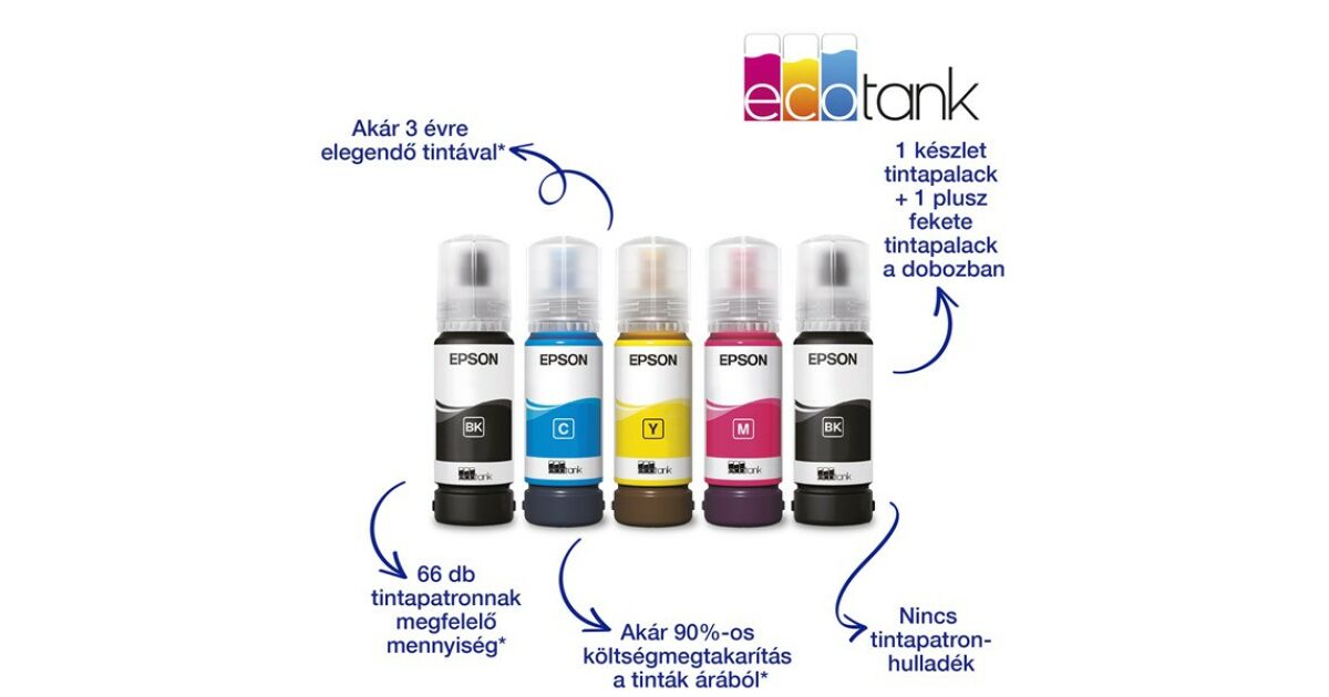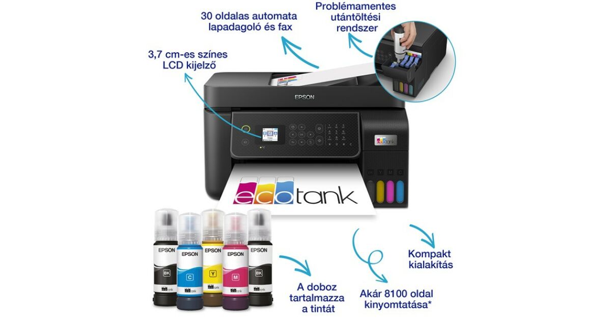 - Nagy kapacitású tintatartályok: A mellékelt tintával akár 8100 oldalt is kinyomtathatsz.