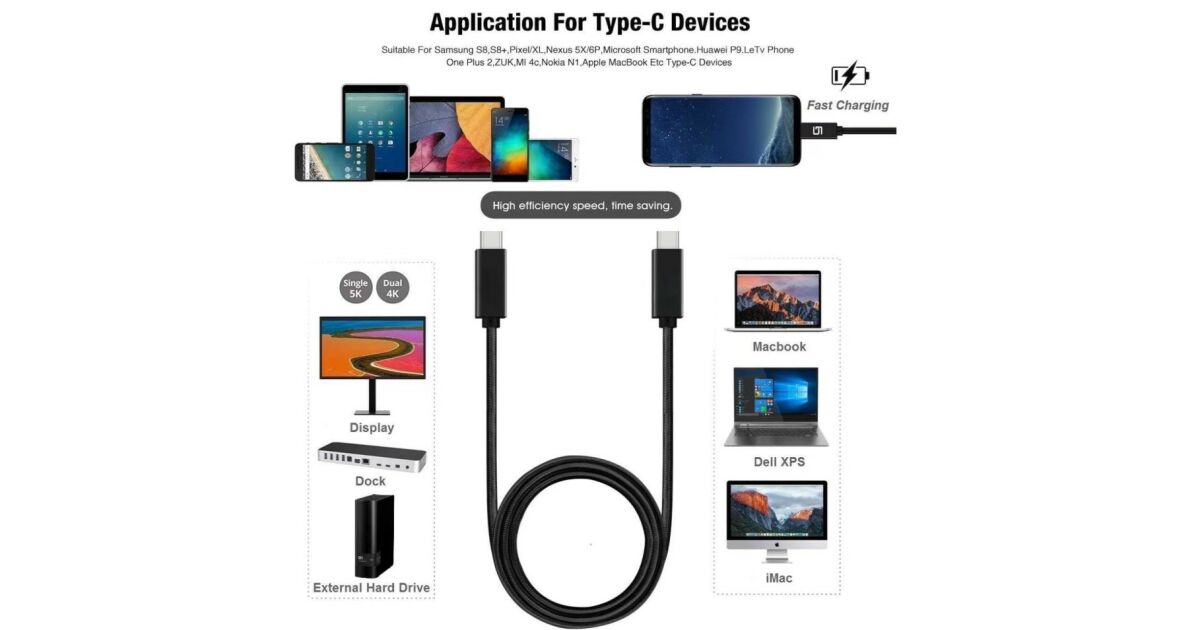 A kábel kompatibilis a legtöbb USB-C csatlakozóval rendelkező eszközzel, beleértve az Apple MacBookokat, Android okostelefonokat és táblagépeket.