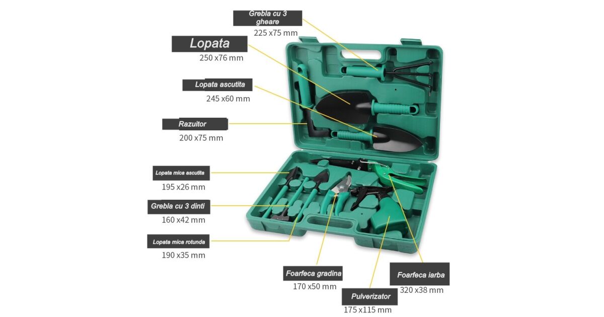 - Teljes körű kertgondozás: Minden szükséges szerszám megtalálható a készletben a kert ápolásához.