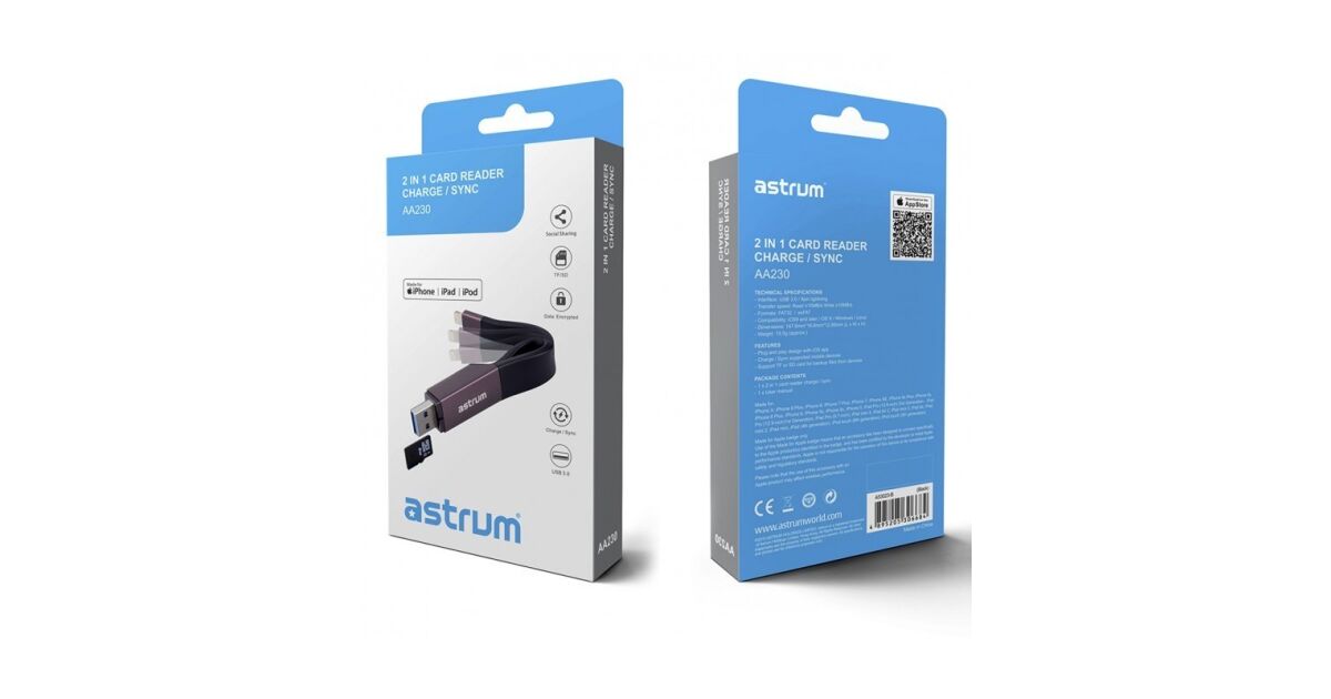 Astrum AA230 2in1 8pin lightning - USB 3.0 OTG adatkábel beépített MicroSD kártyaolvasóval, MFI engedéllyel