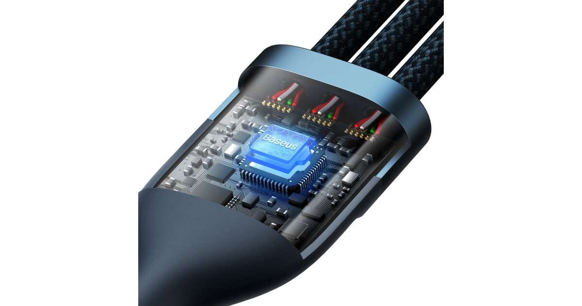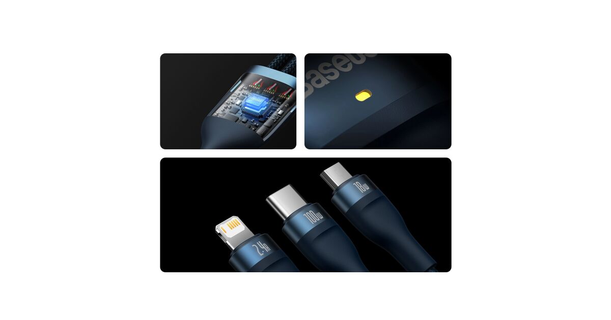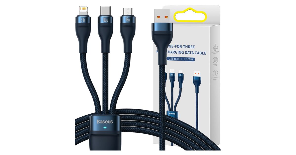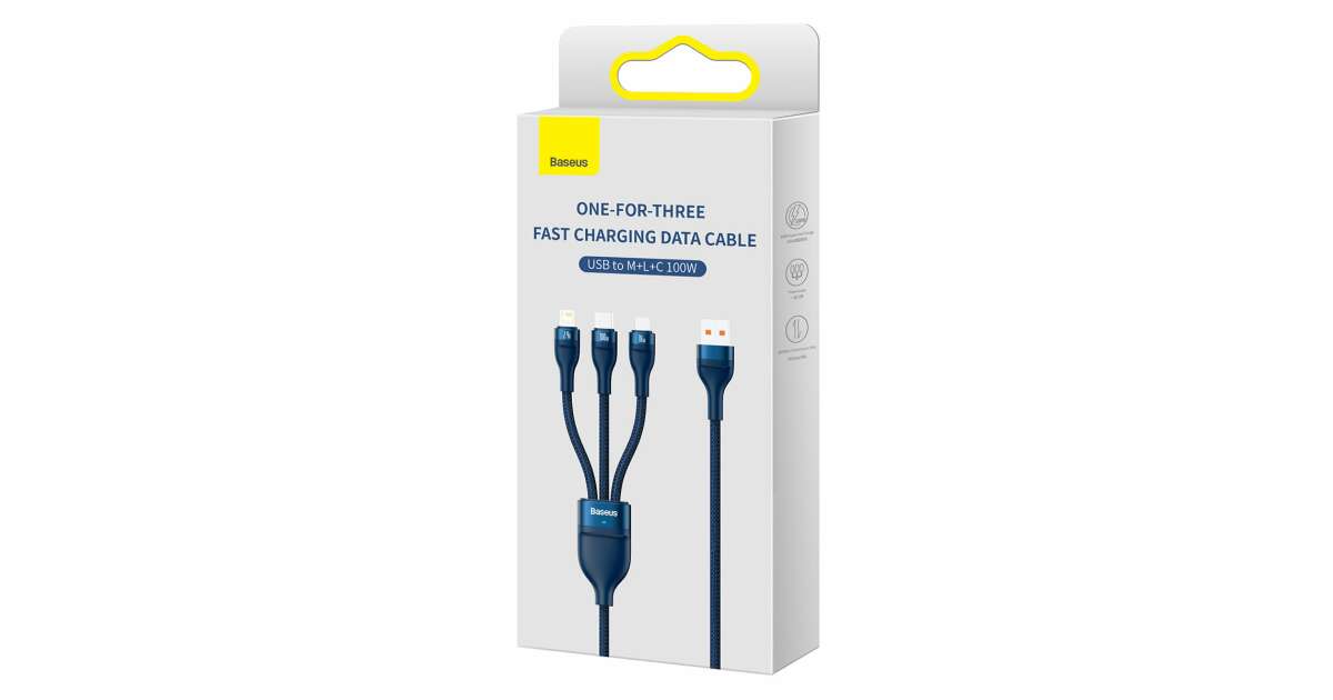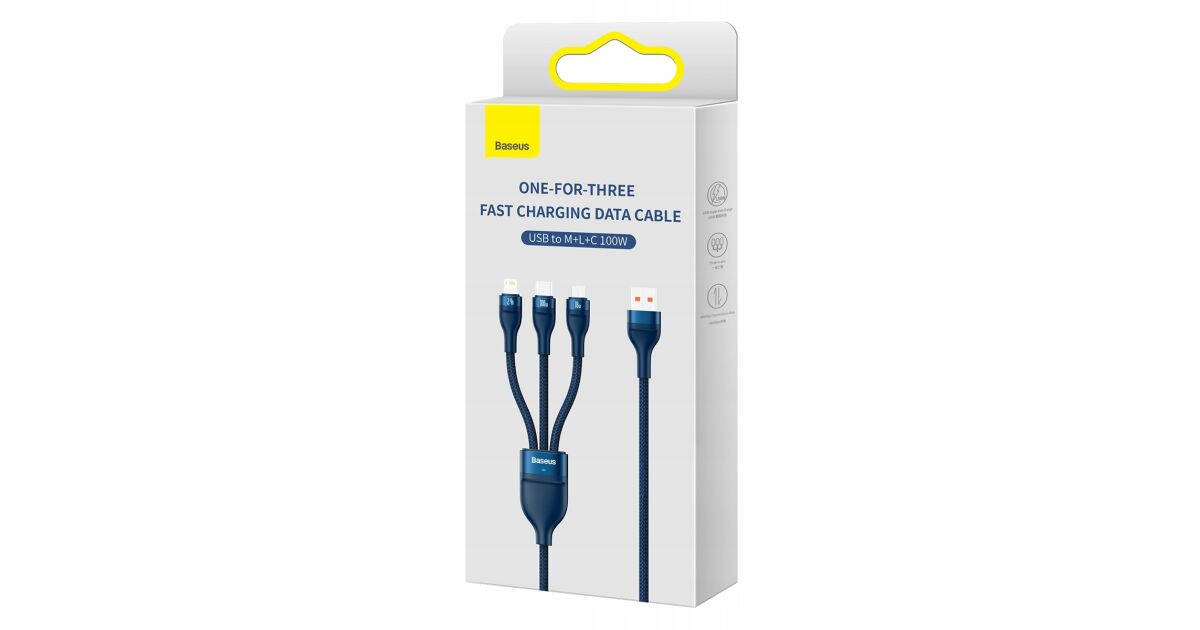 3-in-1 USB cable Baseus Flash Series Conveniently charge up to 3 devices at the same time. USB 3 in 1 cable Baseus Flash Series is equipped with 3 connectors - USB-C, lightning and micro USB. It allows fast charging with up to 100W of power. It also allows you to transfer files at speeds up to 480Mbps (on the USB-C / lightning connector). At the same time, it is extremely durable and ensures safety of use. Fast charging You no longer have to wait indefinitely for your devices to be charged. Baseus Flash Series cable allows you to charge selected equipment with power up to 100W. What does it mean in practice? You can charge your Honor 50 Pro smartphone to 100% in just 27 minutes using a 100W charger, and Huawei Mate 40 Pro to 86% in about 30 minutes using a 66W charger. Charge up to 3 devices simultaneously No more waiting for one device to be charged before you connect another! Thanks to 3 available connectors (USB-C, micro USB and lightning) you can easily power up to 3 devices at the same time. The cable is distinguished by its wide compatibility. Using it you can charge your iPhone, Xiaomi, Huawei, Samsung and OPPO smartphones, tablets, powerbanks and desktop fans. Safety of use The Baseus Flash Series cable allows not only fast but also safe charging. It is equipped with an intelligent chip which automatically adjusts its operation to the requirements of the connected device, protecting it from damage. The product is also protected against overheating and low temperature. Clever design Enjoy the comfort of use. The cable is 1.2m long, so you can use your device comfortably while charging. There are also engraved markings next to each connector informing about maximum power or current. The product has also been equipped with a special light indicator that allows you to check whether the fast or regular charging is in progress. Long life Baseus Flash Series cable will serve you well for a long time. The copper core is extremely durable and allows for optimal signal transmission. The nylon braid protects the product from damage and provides it with exceptional durability. The cable is also incredibly flexible and resistant to bending. Lightning-fast file transfers Do you often transfer files between devices? Baseus cable will make this task easier for you too! The product allows you to transfer data at speeds up to 480Mbps (only on lightning and USB-C connectors). You no longer have to wait endlessly for your files to reach their destination - now you can copy everything you need in no time! Brand Baseus Name Flash Series II One-for-three Fast Charging Data Cable Model CASS030003 Color Blue Material Aluminum alloy, nylon Capacity USB-C / 6A, Lightning / 2.4A, Micro USB / 2A (QC 18W), Micro USB + lightning + USB-C (5V / 3.5A) Transmission Speed (USB-C and Lightning) Up to 480Mbps Input USB Output Micro USB + Lightning + USB-C Length 1.2m