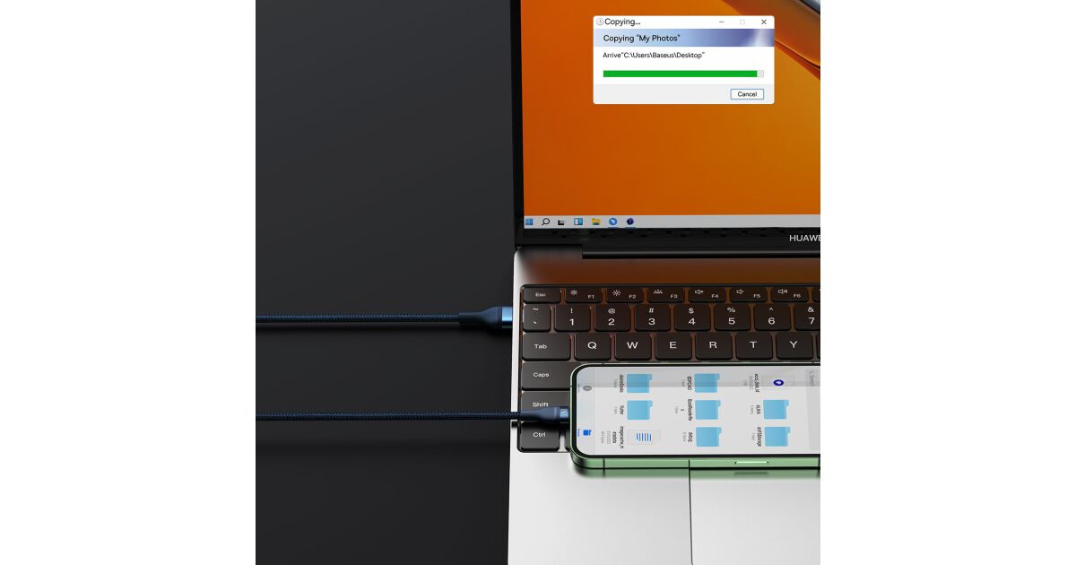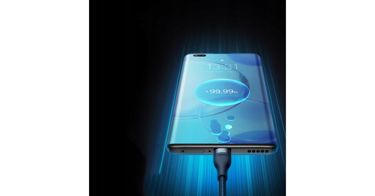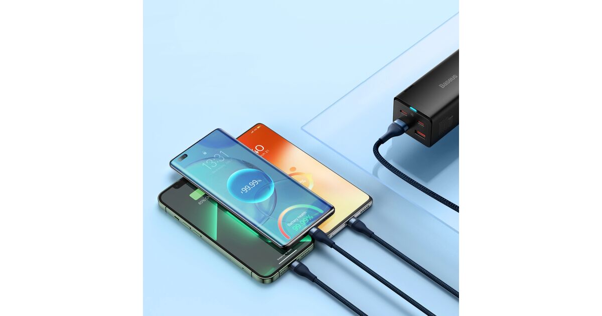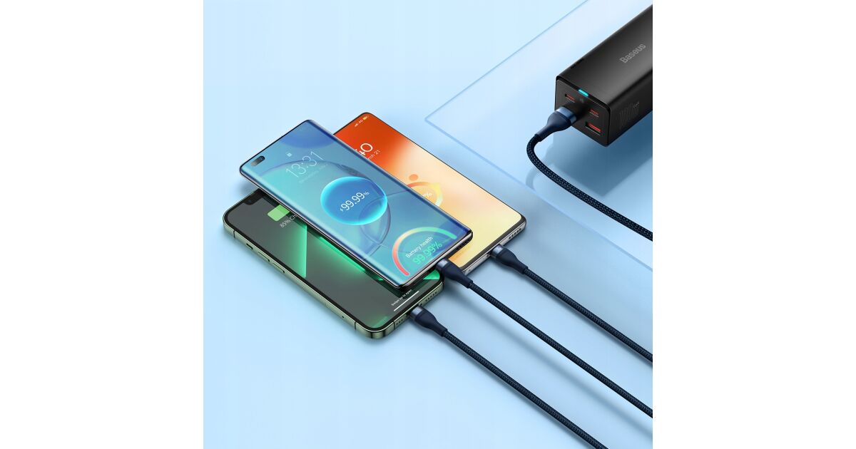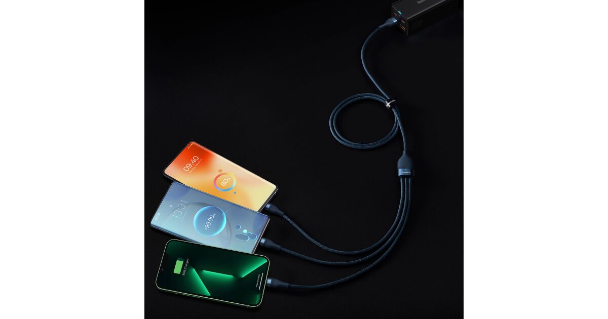 3-in-1 USB cable Baseus Flash Series Conveniently charge up to 3 devices at the same time. USB 3 in 1 cable Baseus Flash Series is equipped with 3 connectors - USB-C, lightning and micro USB. It allows fast charging with up to 100W of power. It also allows you to transfer files at speeds up to 480Mbps (on the USB-C / lightning connector). At the same time, it is extremely durable and ensures safety of use. Fast charging You no longer have to wait indefinitely for your devices to be charged. Baseus Flash Series cable allows you to charge selected equipment with power up to 100W. What does it mean in practice? You can charge your Honor 50 Pro smartphone to 100% in just 27 minutes using a 100W charger, and Huawei Mate 40 Pro to 86% in about 30 minutes using a 66W charger. Charge up to 3 devices simultaneously No more waiting for one device to be charged before you connect another! Thanks to 3 available connectors (USB-C, micro USB and lightning) you can easily power up to 3 devices at the same time. The cable is distinguished by its wide compatibility. Using it you can charge your iPhone, Xiaomi, Huawei, Samsung and OPPO smartphones, tablets, powerbanks and desktop fans. Safety of use The Baseus Flash Series cable allows not only fast but also safe charging. It is equipped with an intelligent chip which automatically adjusts its operation to the requirements of the connected device, protecting it from damage. The product is also protected against overheating and low temperature. Clever design Enjoy the comfort of use. The cable is 1.2m long, so you can use your device comfortably while charging. There are also engraved markings next to each connector informing about maximum power or current. The product has also been equipped with a special light indicator that allows you to check whether the fast or regular charging is in progress. Long life Baseus Flash Series cable will serve you well for a long time. The copper core is extremely durable and allows for optimal signal transmission. The nylon braid protects the product from damage and provides it with exceptional durability. The cable is also incredibly flexible and resistant to bending. Lightning-fast file transfers Do you often transfer files between devices? Baseus cable will make this task easier for you too! The product allows you to transfer data at speeds up to 480Mbps (only on lightning and USB-C connectors). You no longer have to wait endlessly for your files to reach their destination - now you can copy everything you need in no time! Brand Baseus Name Flash Series II One-for-three Fast Charging Data Cable Model CASS030003 Color Blue Material Aluminum alloy, nylon Capacity USB-C / 6A, Lightning / 2.4A, Micro USB / 2A (QC 18W), Micro USB + lightning + USB-C (5V / 3.5A) Transmission Speed (USB-C and Lightning) Up to 480Mbps Input USB Output Micro USB + Lightning + USB-C Length 1.2m