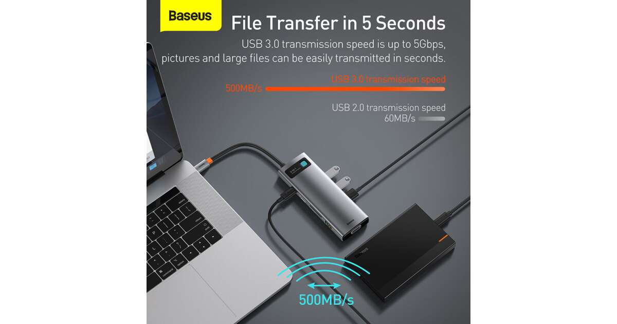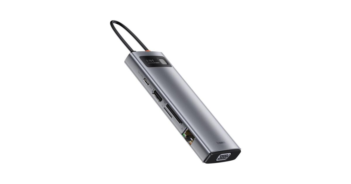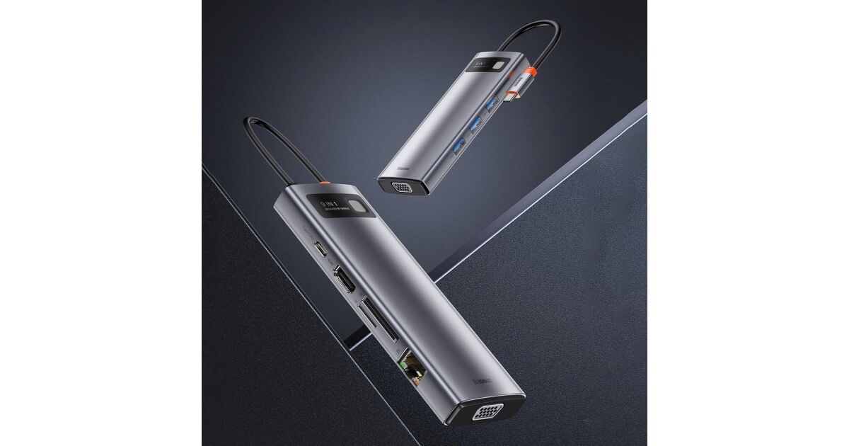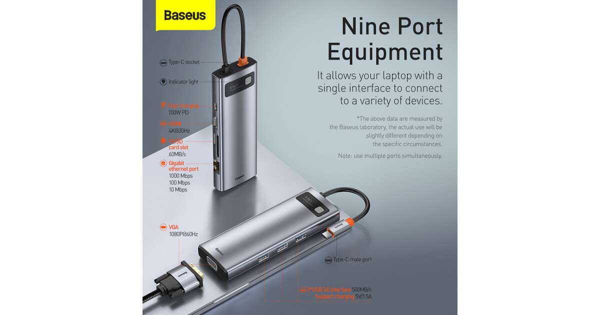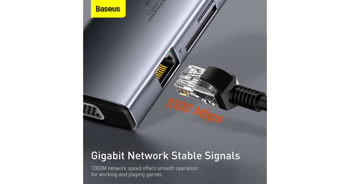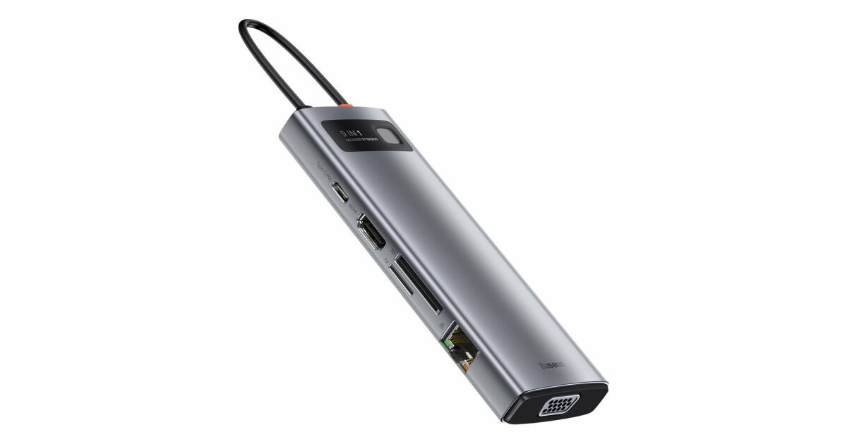 Ezt a terméket így is ismerheted: Baseus Metal Gleam Series 9in1 Hub USB-C - 3x USB 3.0 + HDMI + USB-C PD + Ethernet RJ45 + microSD / SD + VGA #szürke