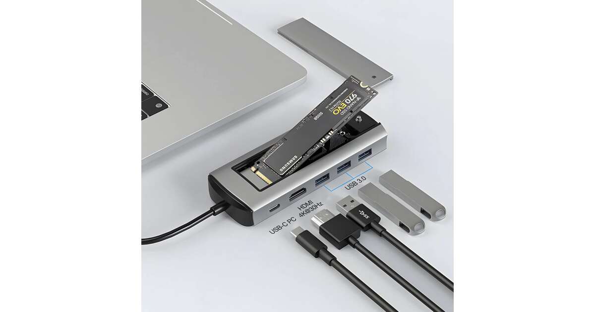 Egyszerű használat: Csatlakoztassa a hub Type-C portját laptopjához, és azonnal használhatja a további portokat. A beépített M.2 SSD foglalatba könnyedén behelyezheti az SSD-jét.