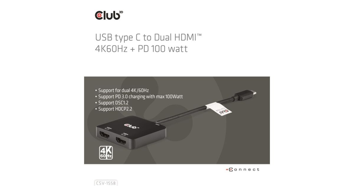 Ezt a terméket így is ismerheted: Club 3D USB Hub, CSV-1558 (3.2 USB-C to 2xHDMI, USB-C 100W PD3.0, 4k60Hz)