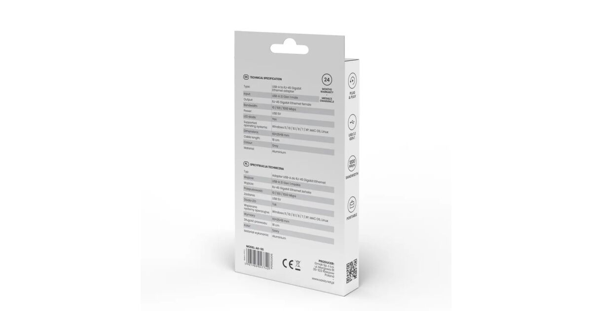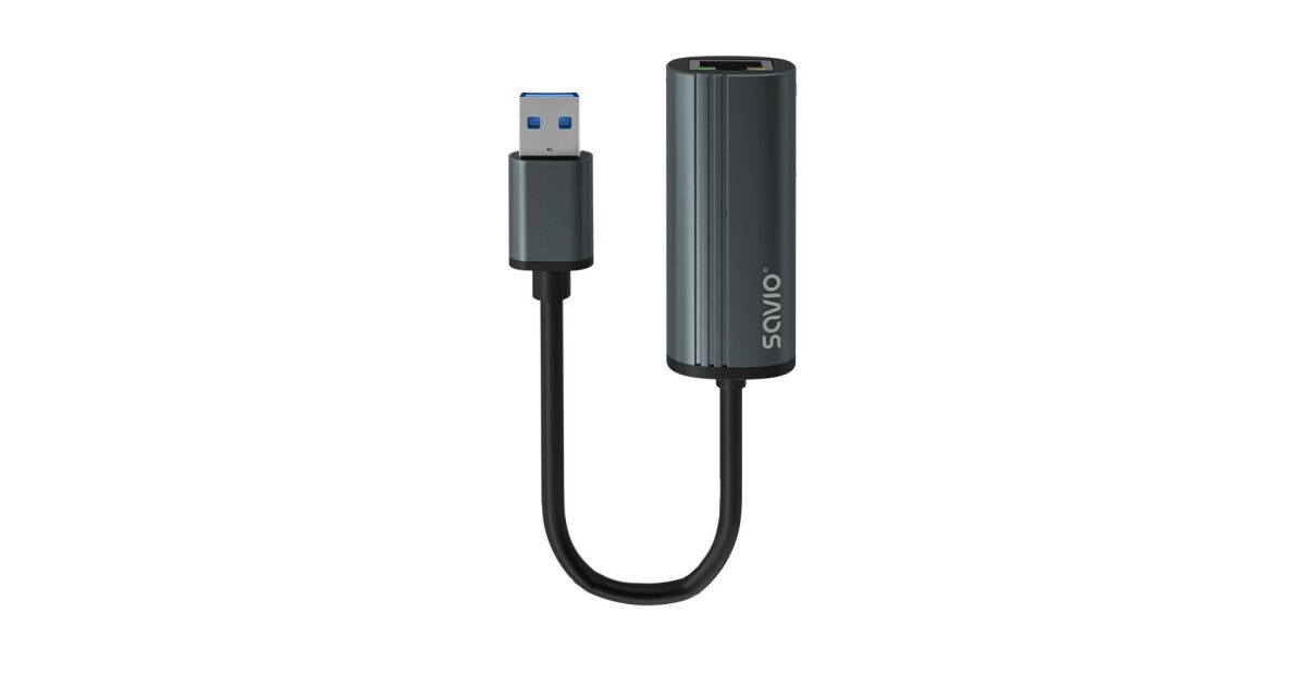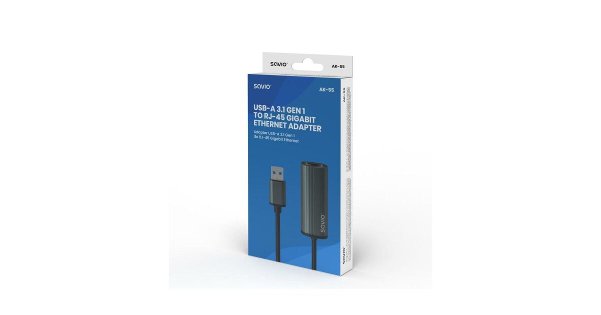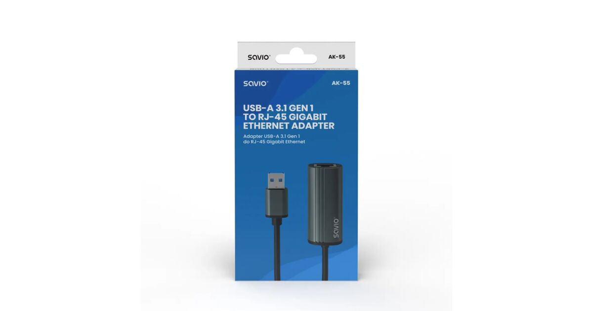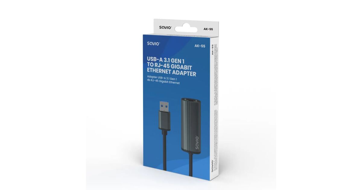 Savio AK-55 Adapter USB-A 3.1 GEN 1 do RJ-45 Gigabit Ethernet USB 3.2 Gen 1 (3.1 Gen 1) Type-A 1000 Mbit/s Fekete leírása