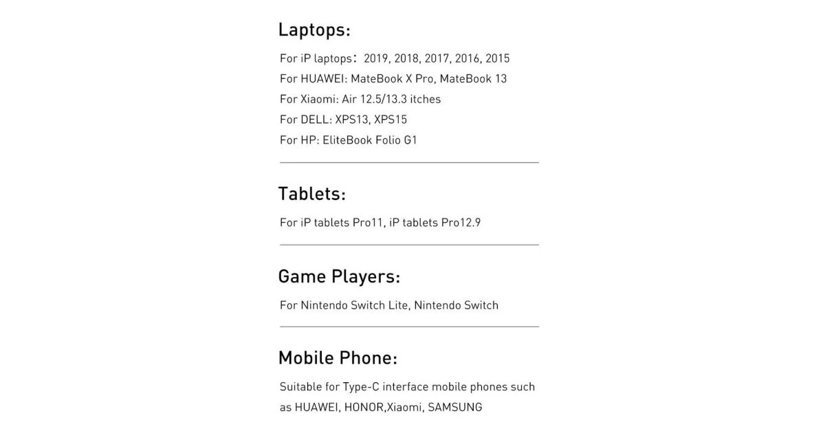 A kábel számos népszerű márka, köztük az Apple, Samsung, Huawei, Xiaomi, ASUS, LG, Acer, HTC, Sony, GoPro, OnePlus, OPPO, Vivo, Motorola, Meizu, ZTE, Wiko, Infinix és Honor eszközökkel kompatibilis. A pontos kompatibilitás érdekében ellenőrizd a gyártó specifikációit.